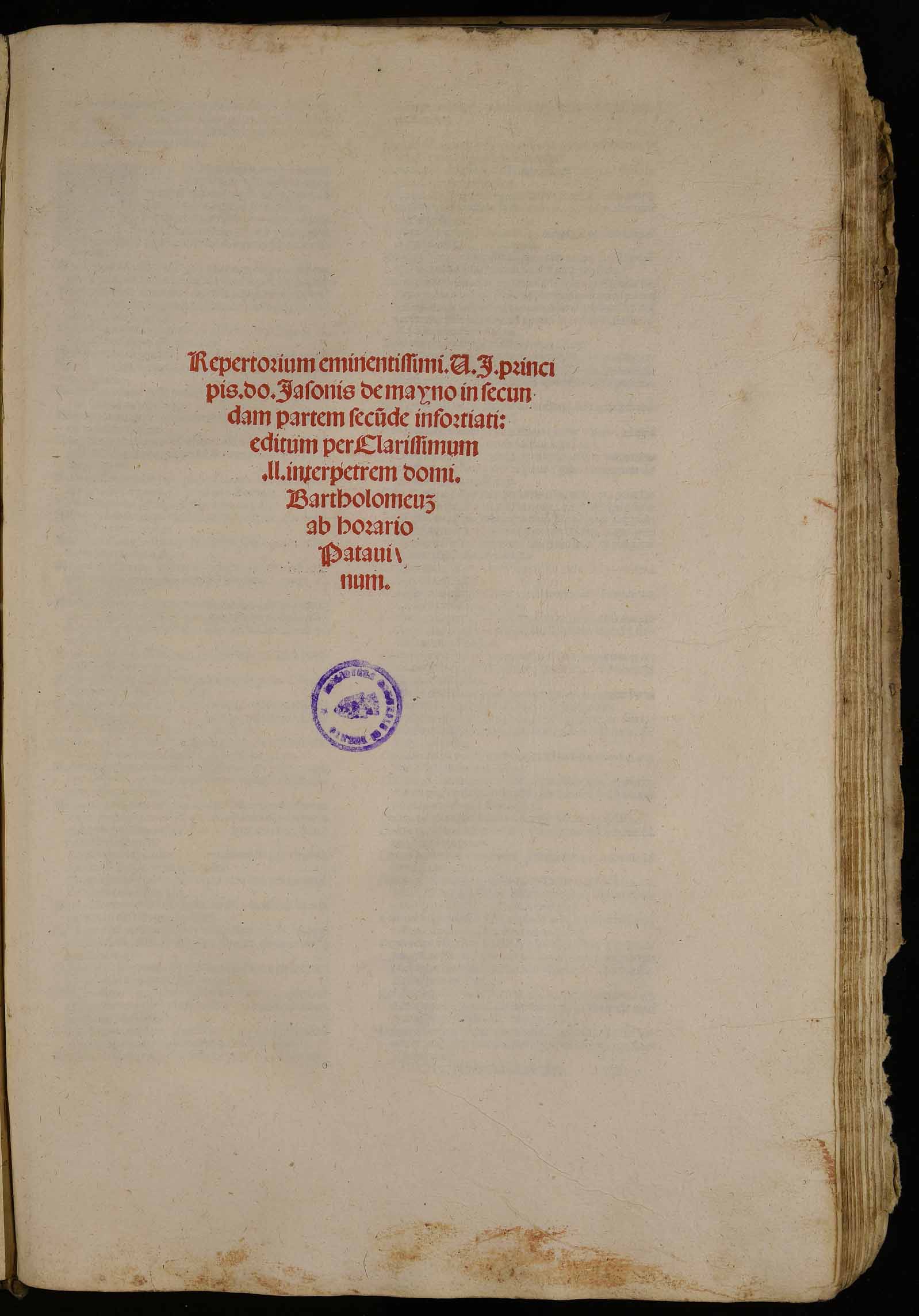 | Repertorium eminentissimi U.I. principis do. Iasonis de Mayno in secundam partem secunde infortiati ceditum per clarissimum ll. interpretem domi. Bartholomeum ab Horario Patavinum |