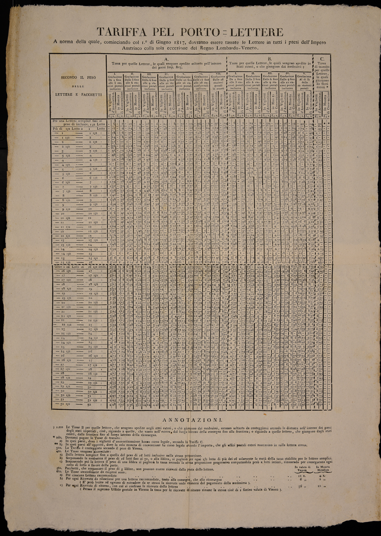 | Tariffa pel porto-lettere a norma della quale, cominciando col 1.° di giugno 1817, dovranno essere tassate le lettere ... |