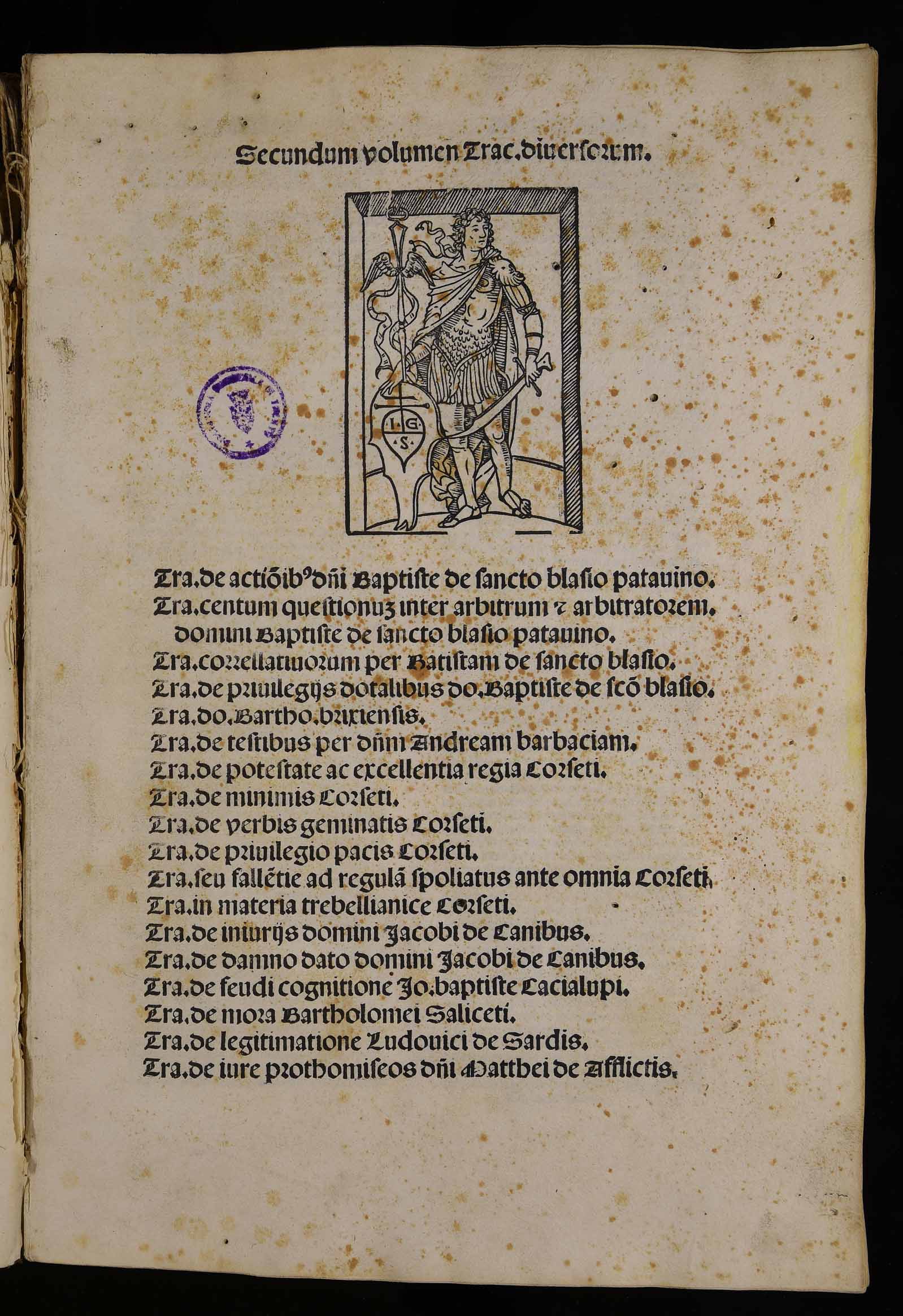 | Secundum volumen tractatuum diversorum. Tractatus de actionibus domine Baptiste de Sancto Blasio Patavino. Tractatus domini Bartholomaei Brixiensis. Tractatus De testibus per dominum Andream Barbatiam. Tractatus De potestate ac excellentia regia Corseti. Tractatus De iniuriis domini Iacobi de Canibus. Tractatus De feudi cognitione Ioannis Baptistae Cacialupi. Tractatus De mora Bartholomei Saliceti. Tractatus De legitimatione Ludovici de Sardis. Tractatus De iure prothomiseos domini Matthei de Afflictis |