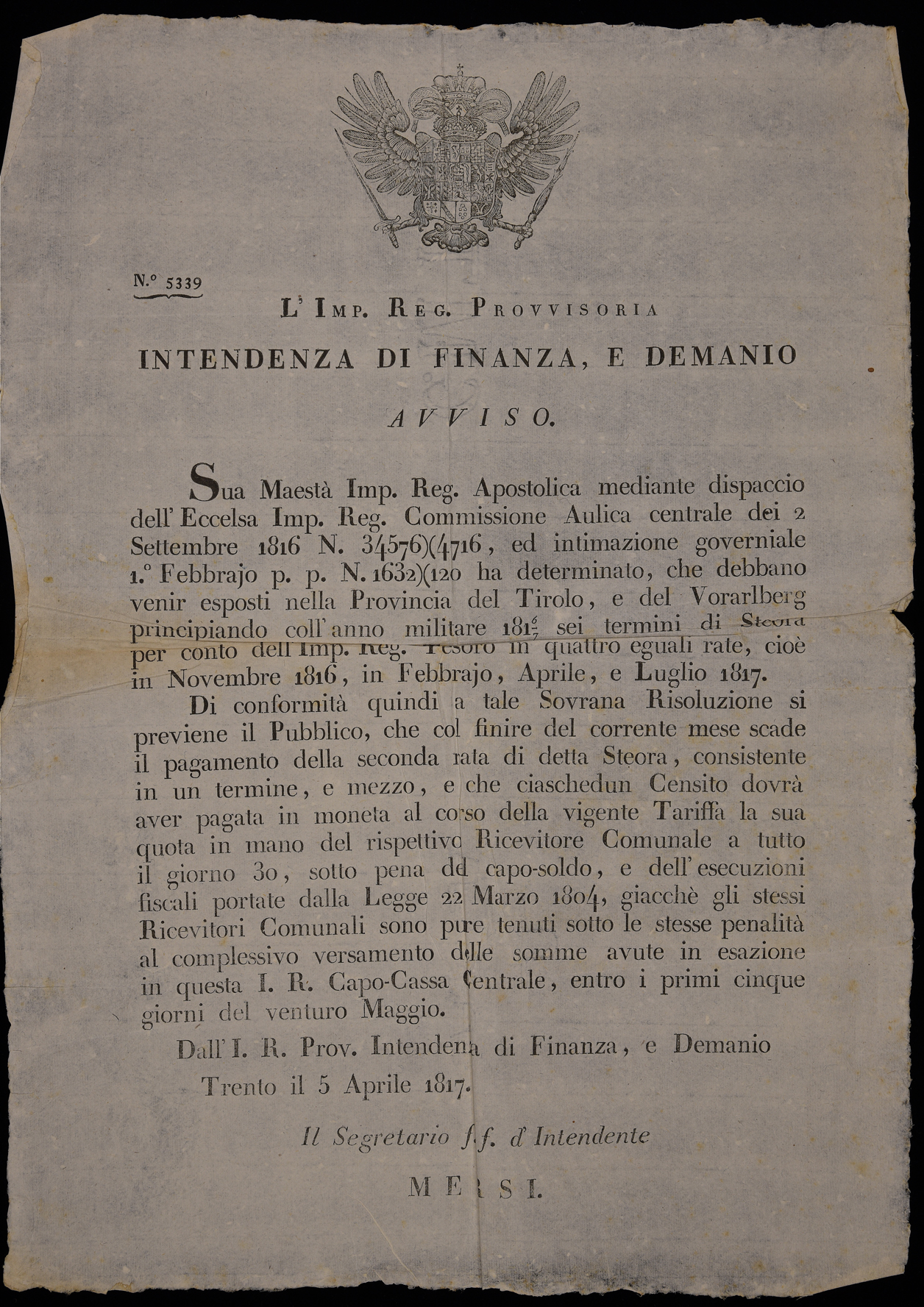 | L'Imp. Reg. Provvisoria Intendenza di Finanza, e Demanio, avviso |