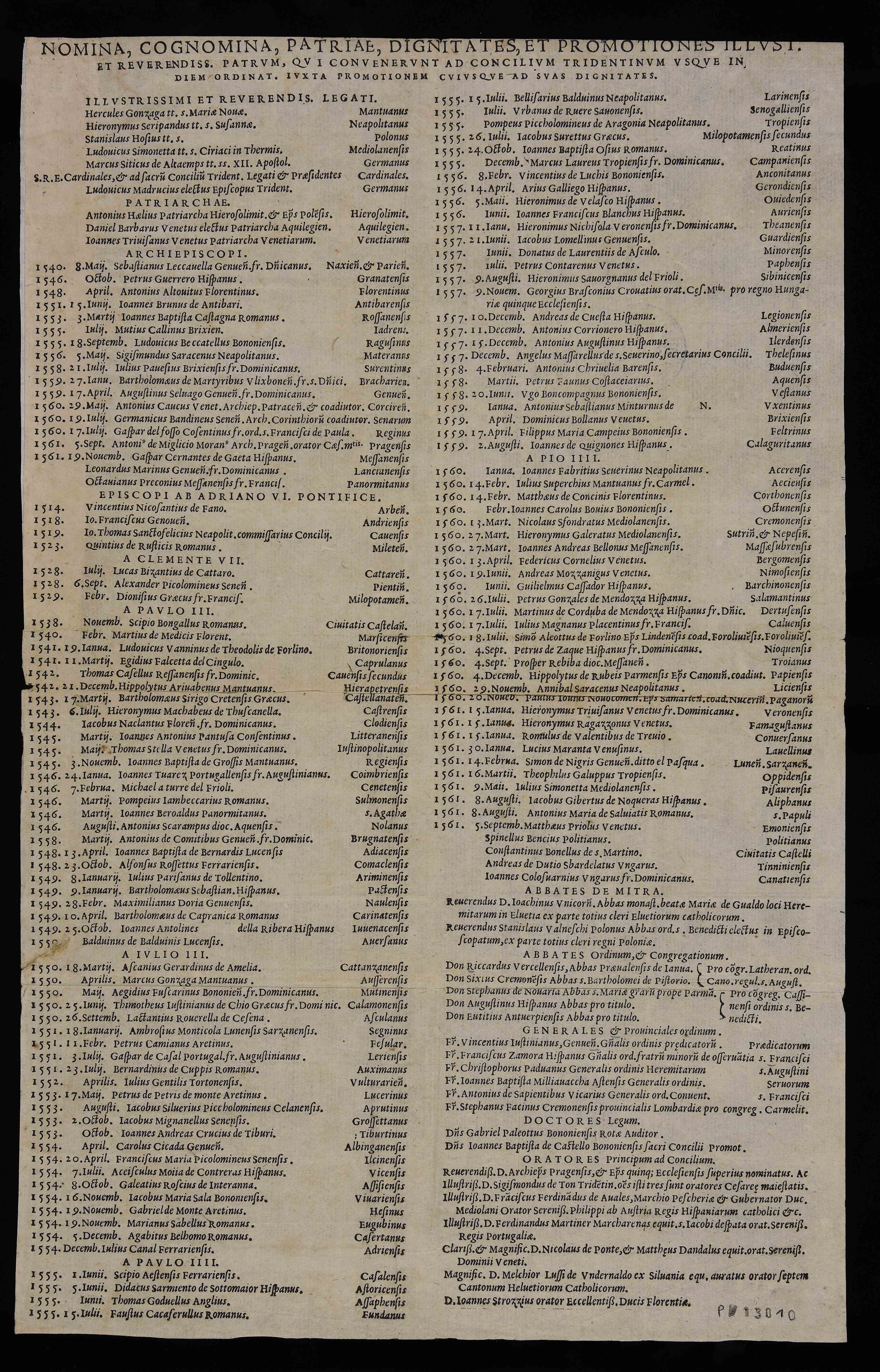 | Nomina, cognomina, patriae, dignitatates, et promotiones illust. et reverendiss. patrum, qui convenerunt ad Concilium Tridentinum usque in diem ordinat. iuxta promotionem cuiusque ad suas dignitates |