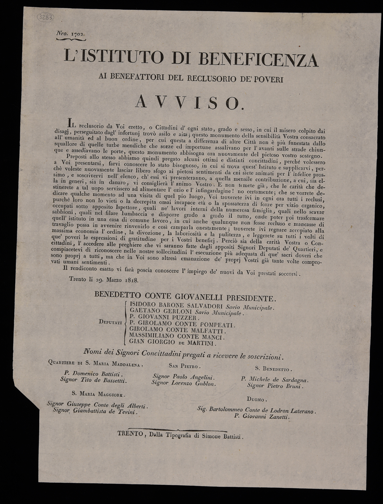 | L'Istituto di Beneficenza ai benefattori del reclusorio de' poveri, avviso |