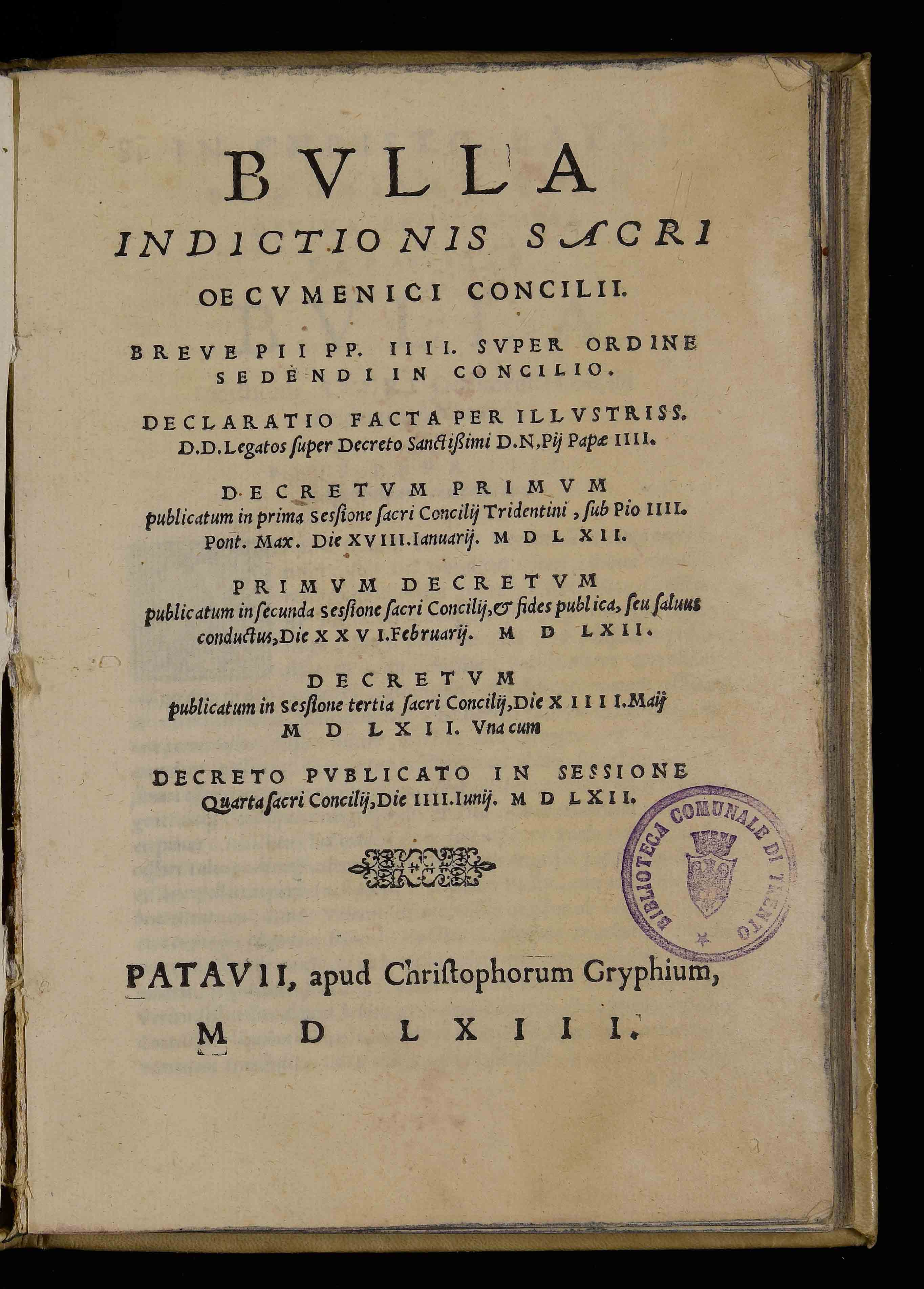 | Bulla indictionis sacri oecumenici Concilii. Breve Pii pp. IIII super ordine sedendi in Concilio. Declaratio facta per illustriss. d.d. legatos super decreto sanctissimi d.n. Pii papae IIII. Decretum primum publicatum in prima sessione sacri Concilii Tridentini, sub Pio IIII pont. max. die XVIII ianuarii MDLXII. Primum decretum publicatum in secunda sessione sacri Concilii, et fides publica, seu salvus conductus, die XXVI februarii MDLXII. Decretum publicatum in sessione tertia sacri Concilii, die XIIII maii MDLXII. Una cum decreto publicato in sessione quarta sacri Concilii, die IIII iunii MDLXII |