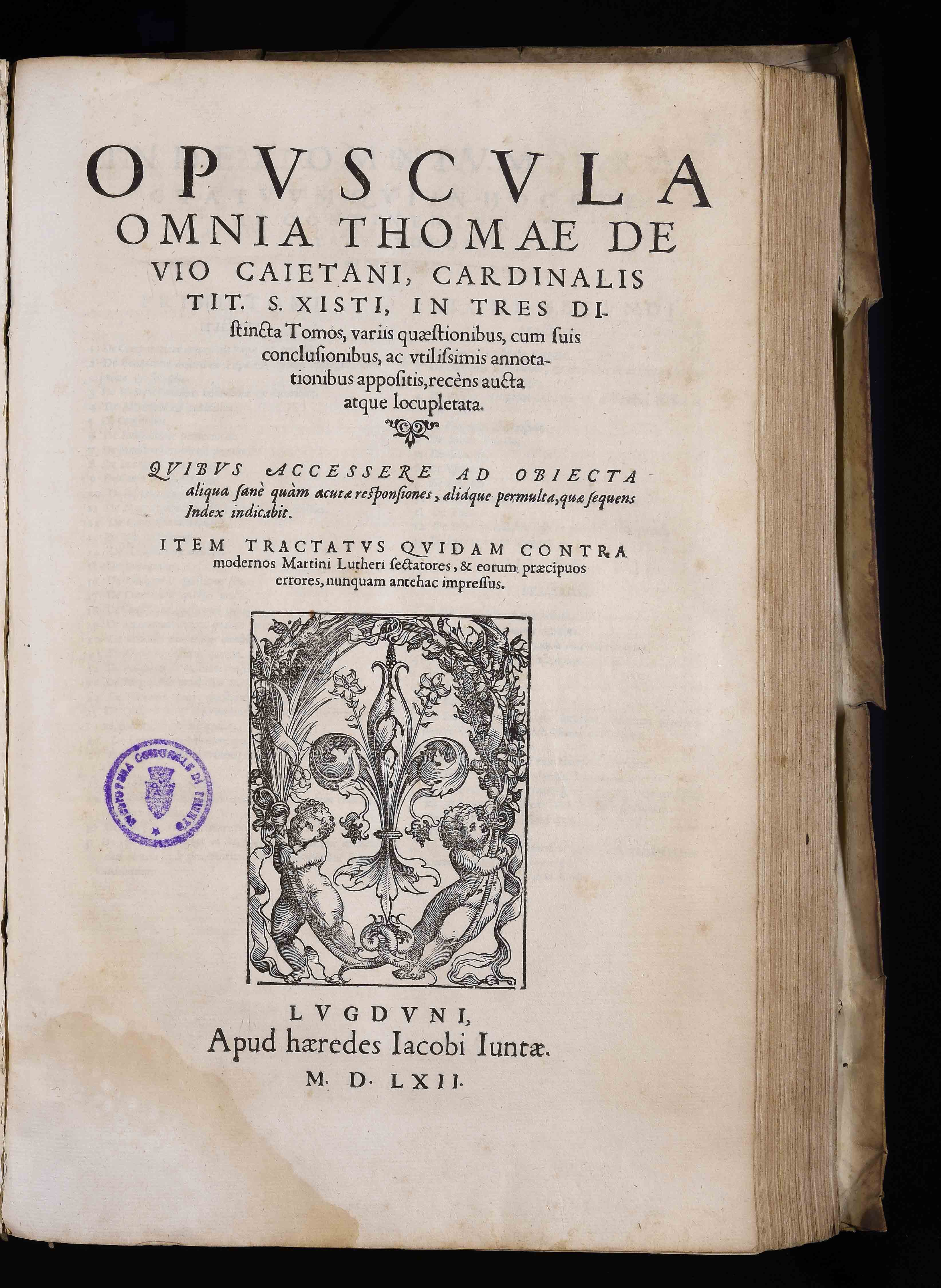 | Opuscula omnia Thomae De Vio Caietani, cardinalis tit. S. Xisti, in tres distincta tomos, variis quaestionibus, cum suis conclusionibus ac utilissimis annotationibus appositis, recens aucta atque locupletata. Quibus accessere ad obiecta aliqua sane quam acutae responsiones, aliaque permulta, quae sequens index indicavit. Item tractatus quidam contra modernos Martini Lutheri sectatores, & eorum praecipuos errores numquam antehac impressus |