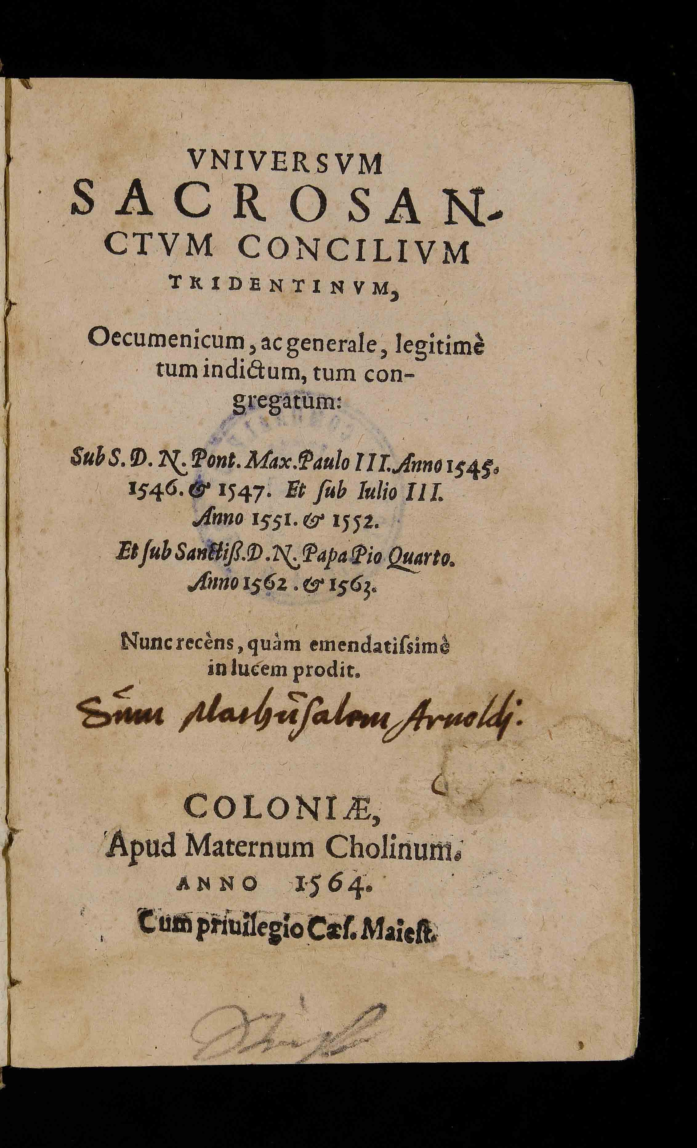 | Universum sacrosanctum Concilium Tridentinum, oecumenicum, ac generale, legitime tum indictum, tum congregatum: sub s.d.n. pont. max. Paulo III anno 1545, 1546 et 1547. Et sub Iulio III anno 1551 et 1552. Et sub sanctiss. d.n. papa Pio quarto anno 1562 et 1563 |