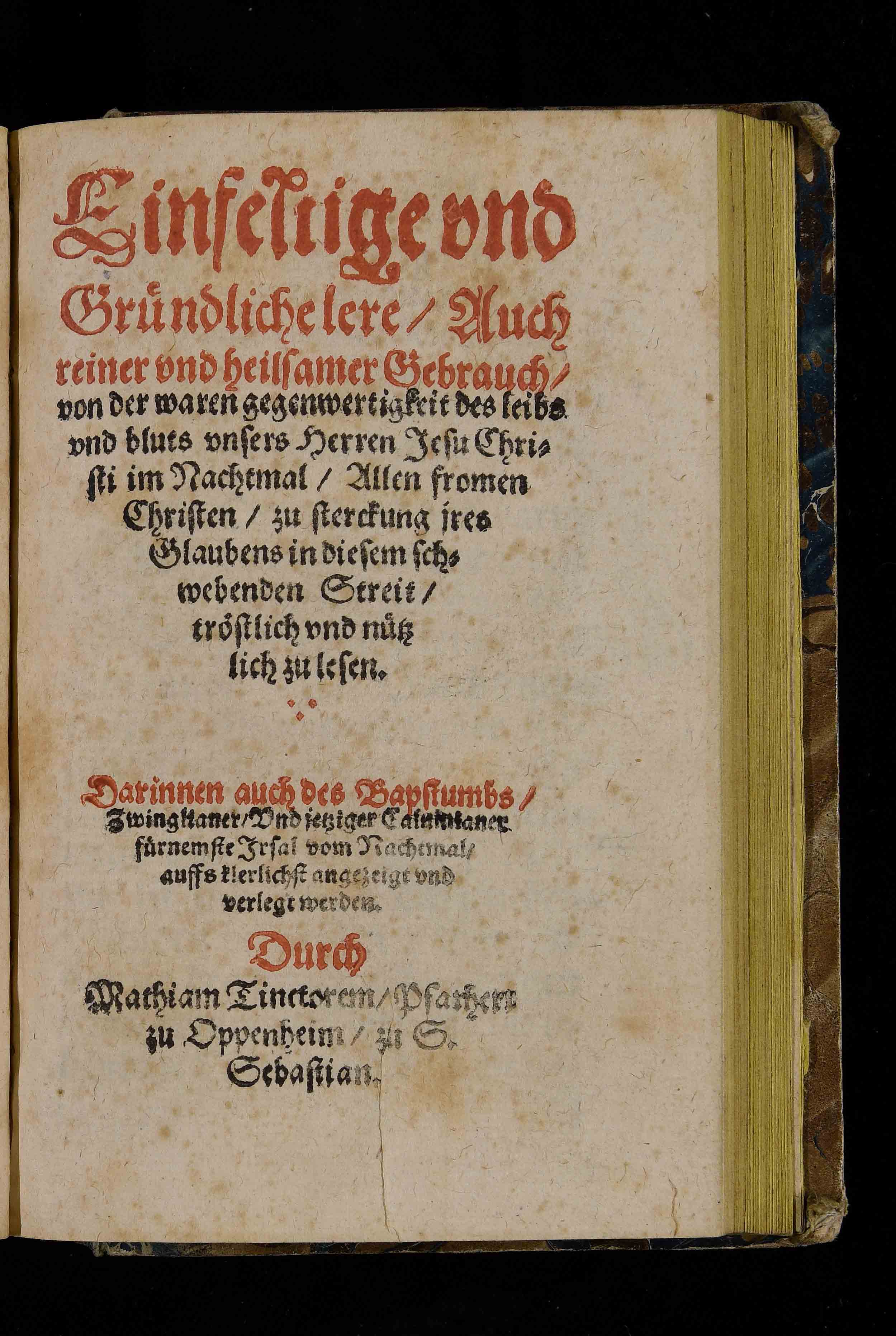 | Einfeltige und Gründliche lere, auch reiner und heilsamer Gebrauch von der waren gegenwertigkeit des leibs und bluts unsers Herren Iesu Christi im Nachtmal, allen fromen Christen zu sterckung ires Glaubens in diesem schwebenden Streit tröstlich und nützlich zu lesen. Darinnen auch des Bapstumbs Zwinglianer und jetziger Calvinianer fürnemste Jrsal vom Nachtmal auffs klerlichst angezeigt und verlegt werden |