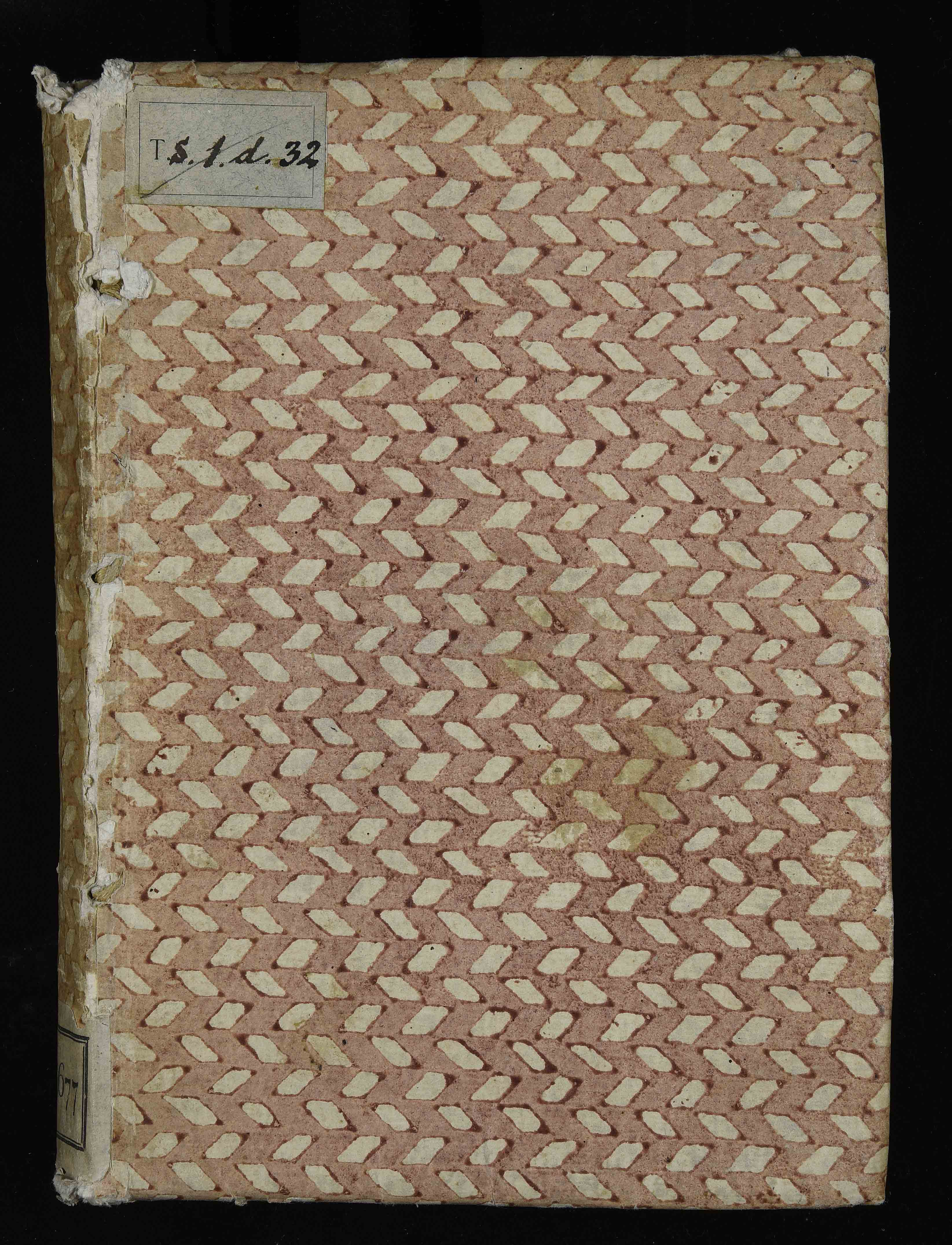 Legatura in cartoncino rivestito con carta decorata del XVIII sec. Antica segnatura di collocazione T.S.1.d.32