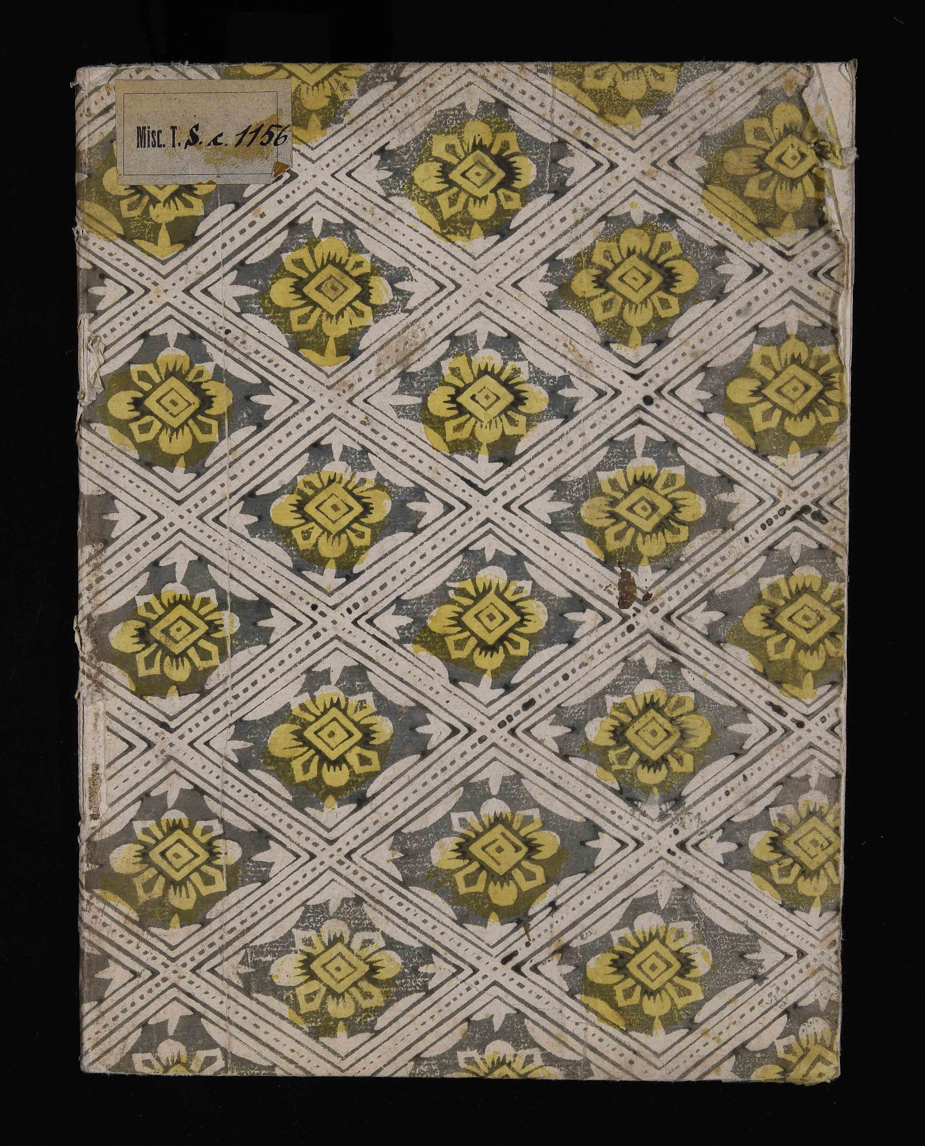 Legatura in cartoncino rivestito con carta decorata del XVIII sec. Antica segnatura di collocazione Misc. T.S.c.1156
