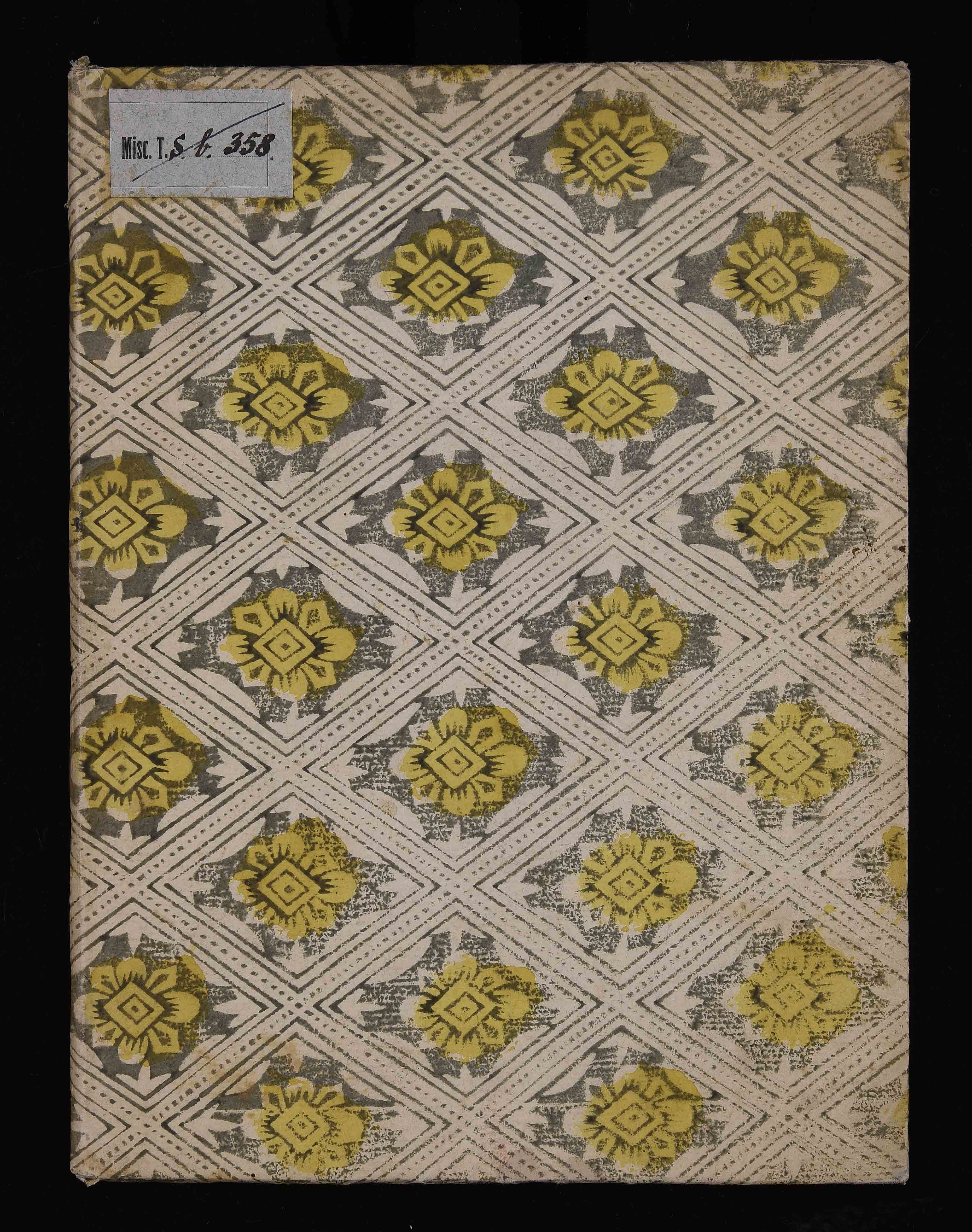 Legatura in cartoncino rivestito con carta decorata del XVIII sec. Antica segnatura di collocazione Misc. T.S.b.358