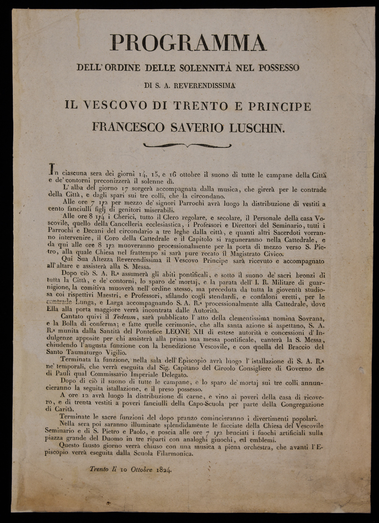 | Programma dell'ordine delle solennità nel possesso di S.A. reverendissima il vescovo di Trento e principe Francesco Saverio Luschin |