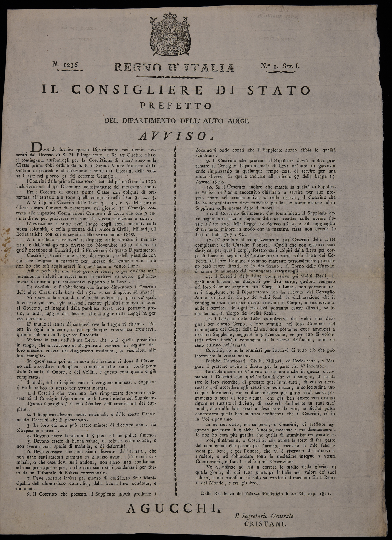 | Regno d'Italia. Il consigliere di Stato, prefetto del Dipartimento dell'Alto Adige. Avviso |