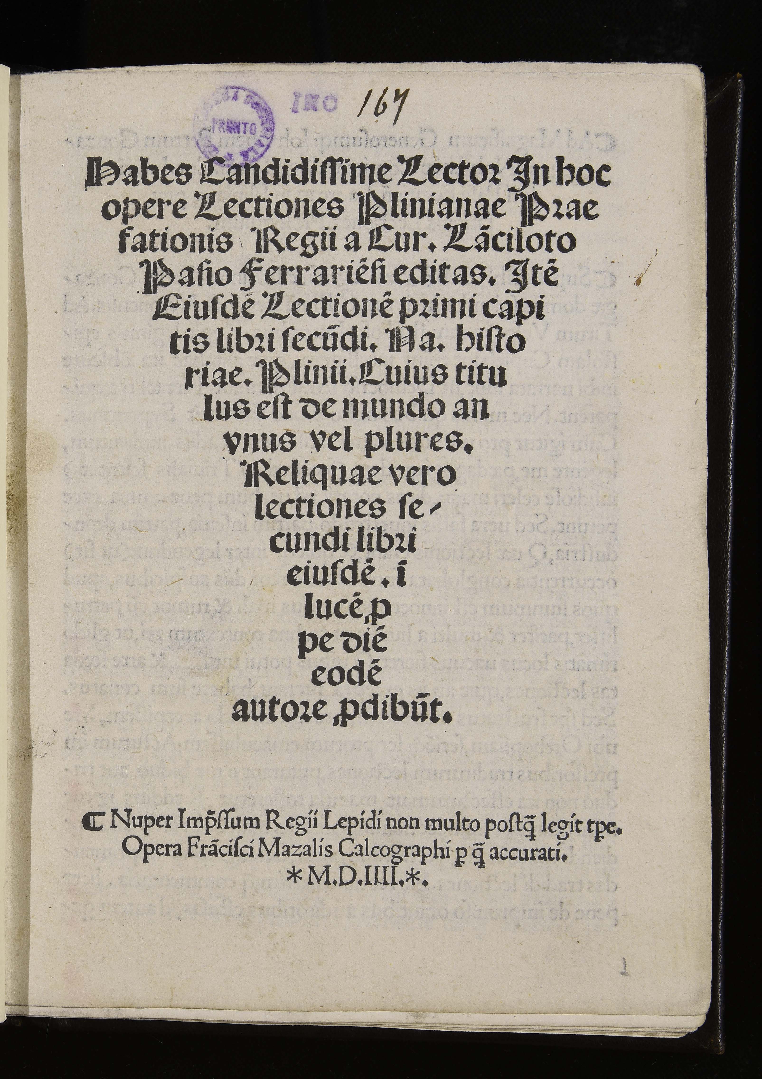 | Habes candidissime lector in hoc opere lectiones Plinianae praefationis Regii a Cur. Lanciloto Paio Ferrariensi editas. Item eiusdem Lectionem primi capitis libri secundi Na. historiae Plinii cuius titulus est de mundo an unus vel plures. Reliquae vero lectiones secundi libri eiusdem in lucem prope diem eodem autore prodibunt |