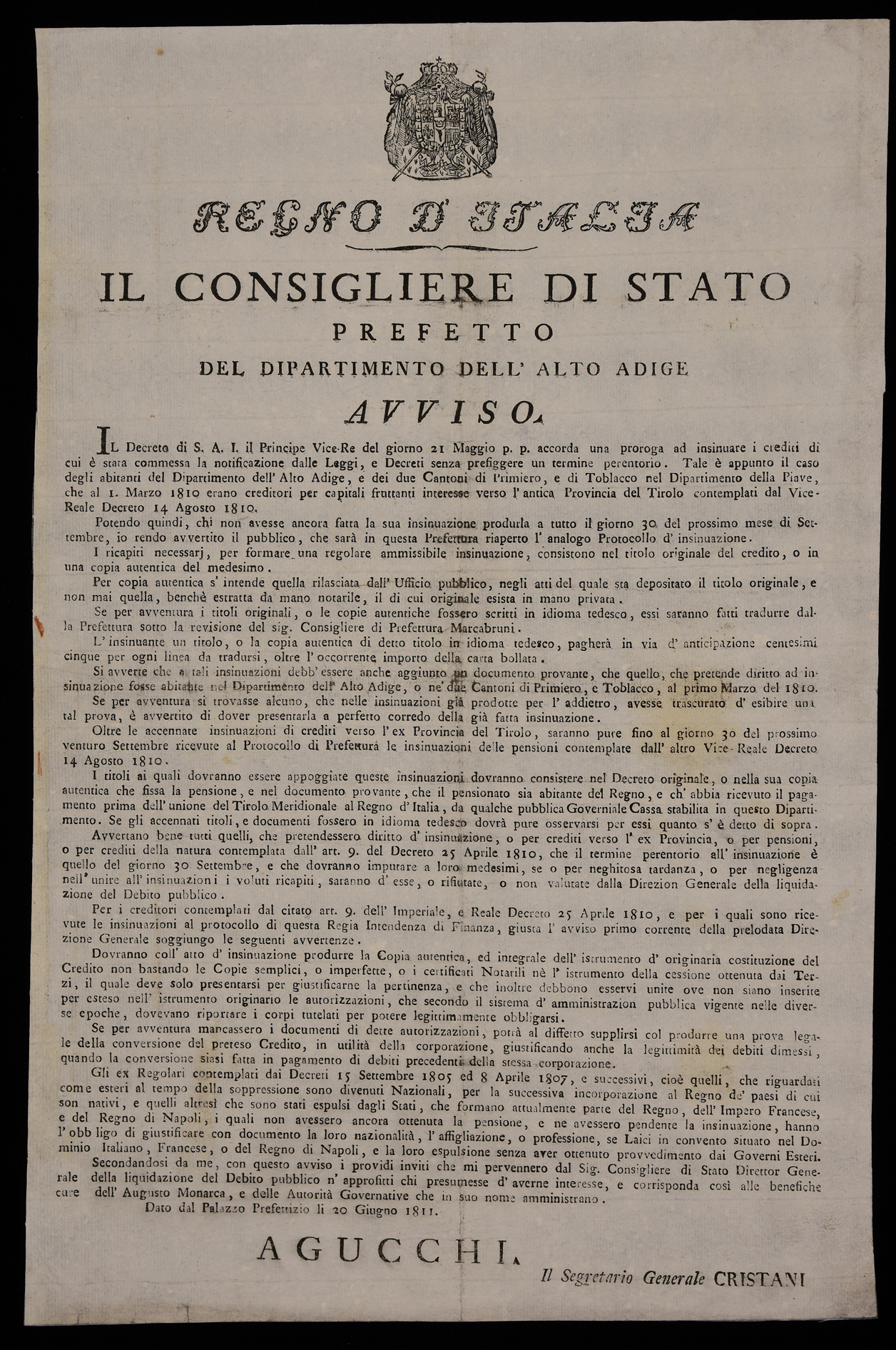 | Regno d'Italia. Il consigliere di Stato, prefetto del Dipartimento dell'Alto Adige. Avviso |