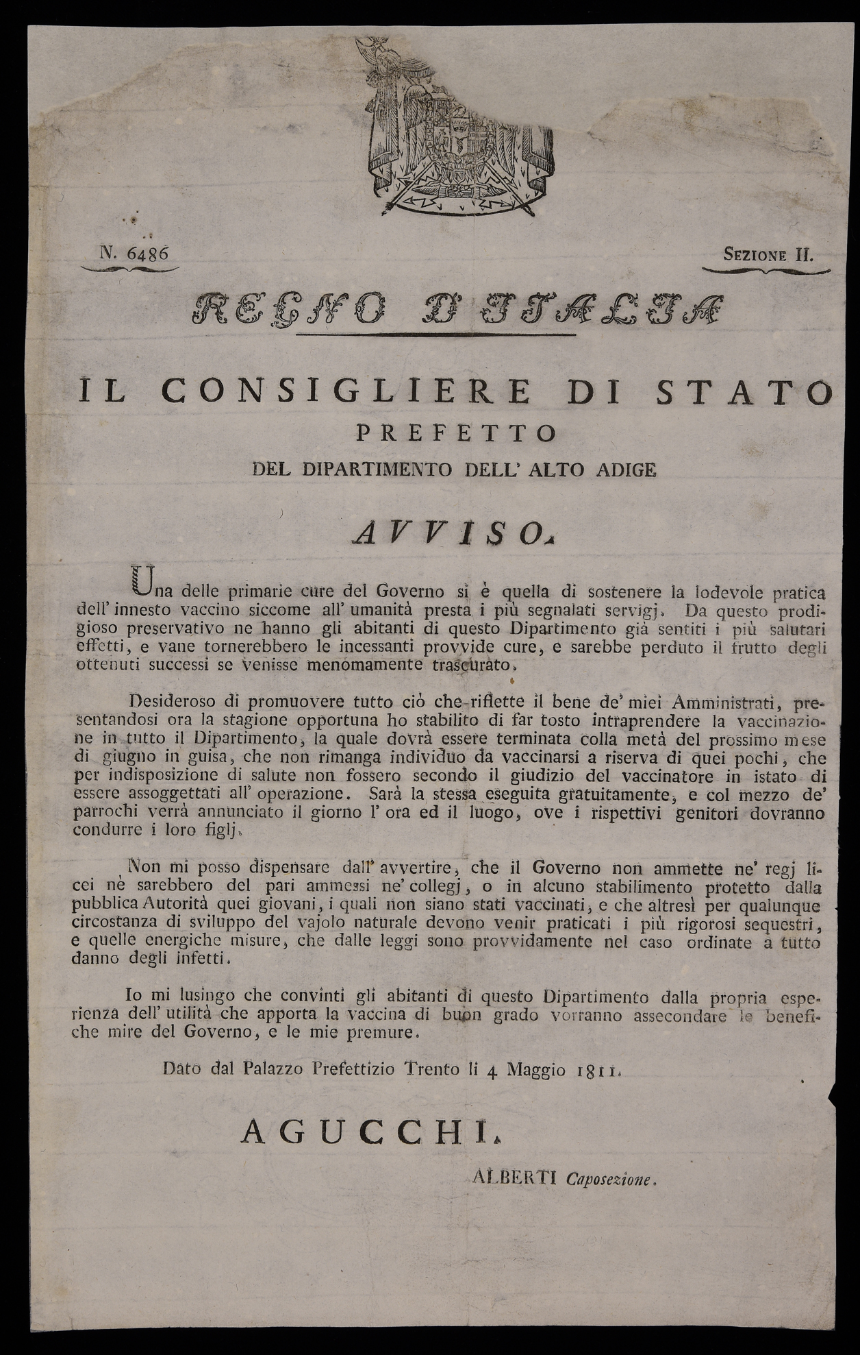 | Regno d'Italia. Il consigliere di Stato, prefetto del Dipartimento dell'Alto Adige. Avviso |