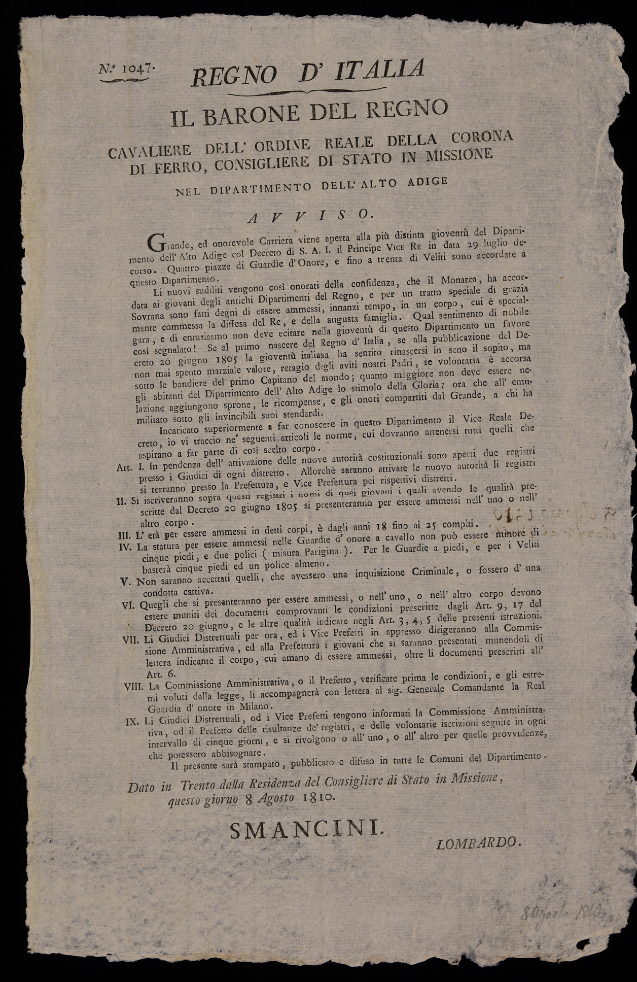 | Regno d'Italia. Il barone del Regno, cavaliere dell'Ordine reale della Corona di ferro, consigliere di Stato in missione nel dipartimento dell'Alto Adige. Avviso |