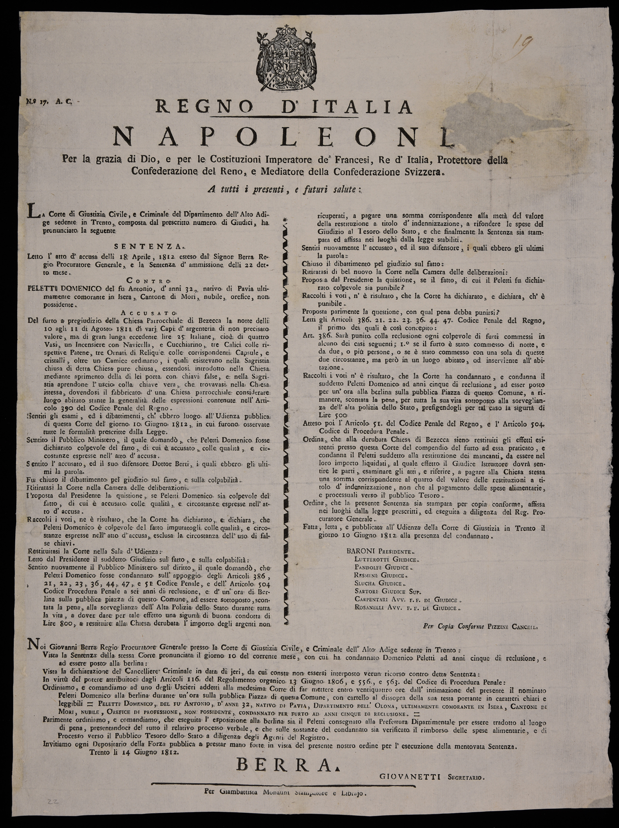 La Corte di Giustizia civile e criminale del Dipartimento dell'Alto Adige sedente in Trento composta dal prescritto numero di giudici ha pronunciato la seguente sentenza ...