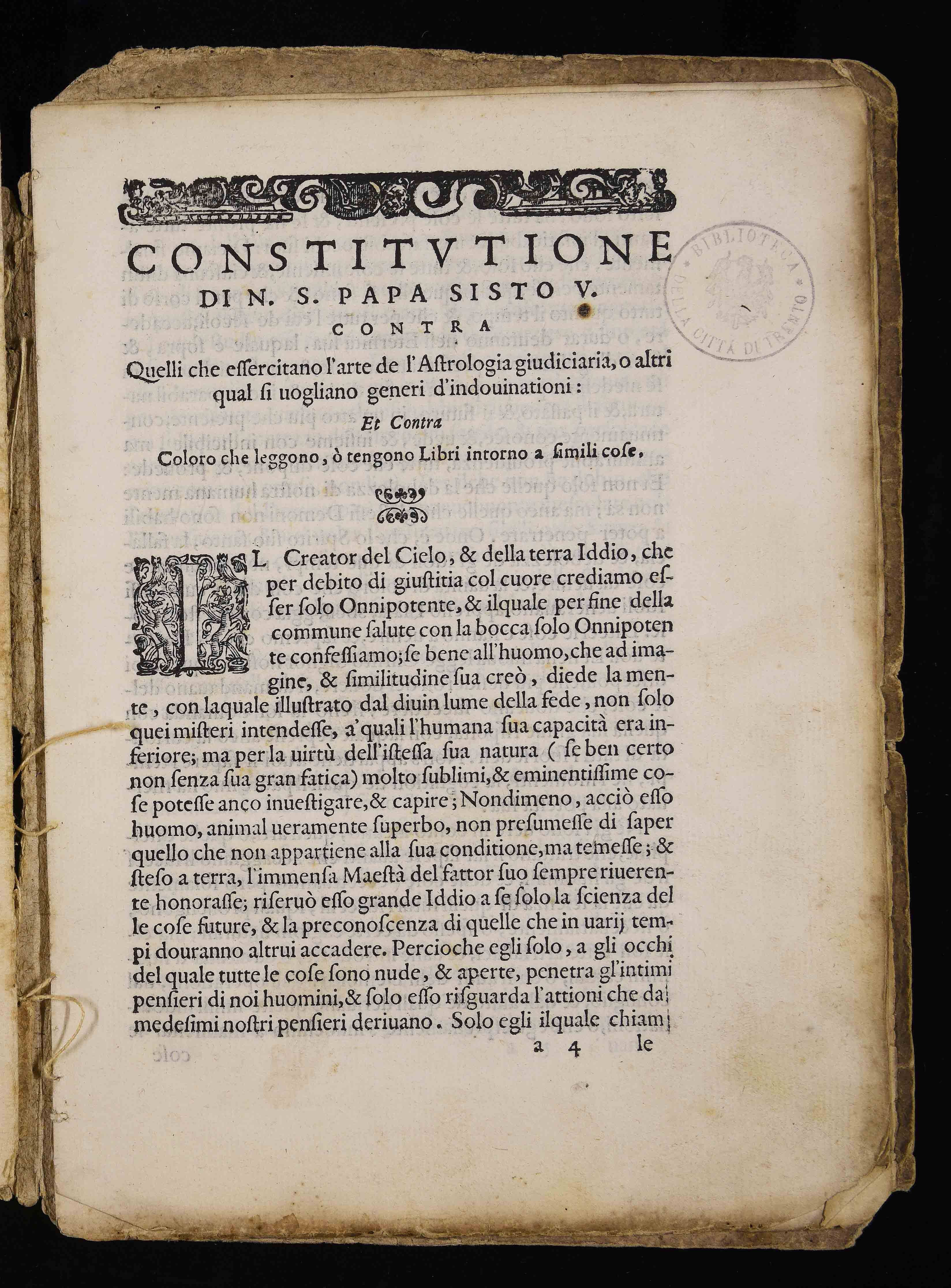 | Constitutione di n.s. papa Sisto V contra quelli che essercitano l'arte de l'astrologia giudiciaria o altri qual si vogliano generi d'indovinationi. Et contra coloro che leggono, o tengono libri intorno a simili cose |