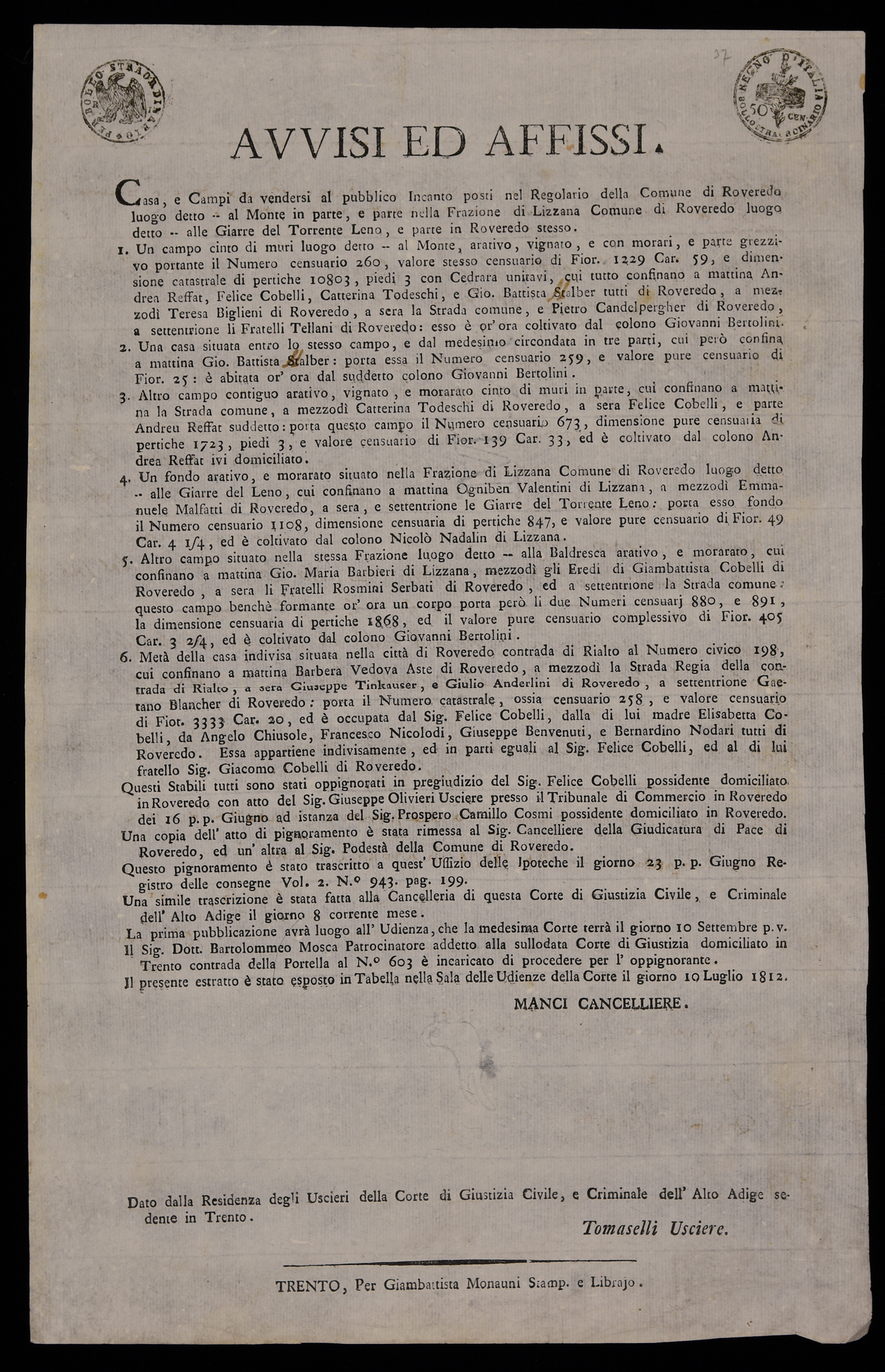 Casa e campi da vendersi al pubblico incanto posti nel regolario della comune di Roveredo ...