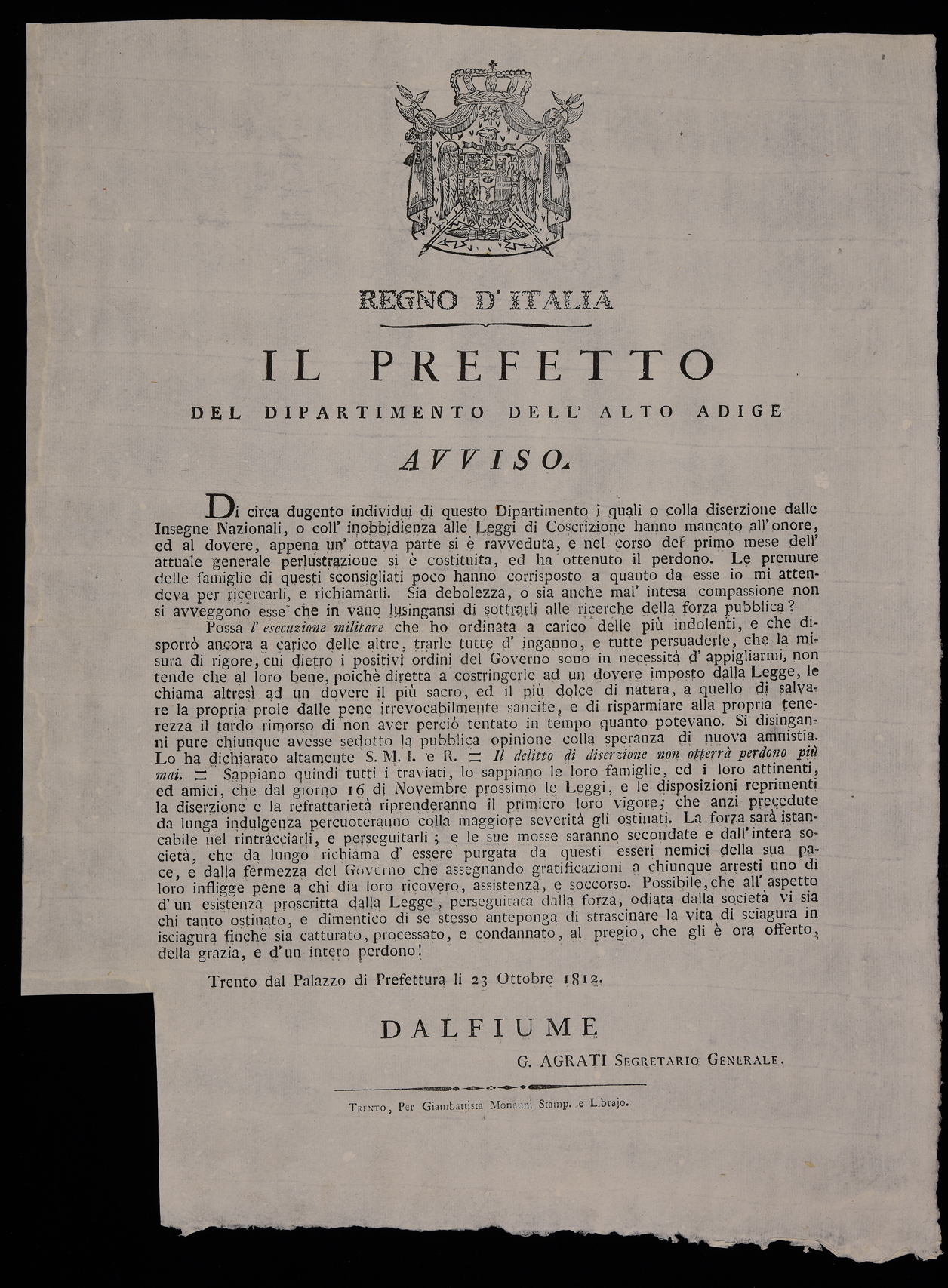 | Regno d'Italia. Il prefetto del Dipartimento dell'Alto Adige. Avviso |