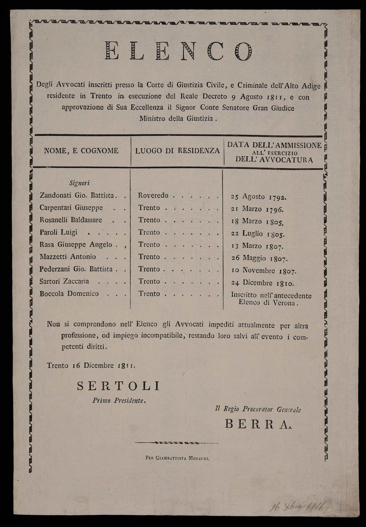 | Elenco degli avvocati inscritti presso la Corte di giustizia civile e criminale dell'Alto Adige residente in Trento in esecuzione del reale decreto 9 agosto 1811 e con approvazione di sua eccellenza il signor conte senatore gran giudice ministro della giustizia |