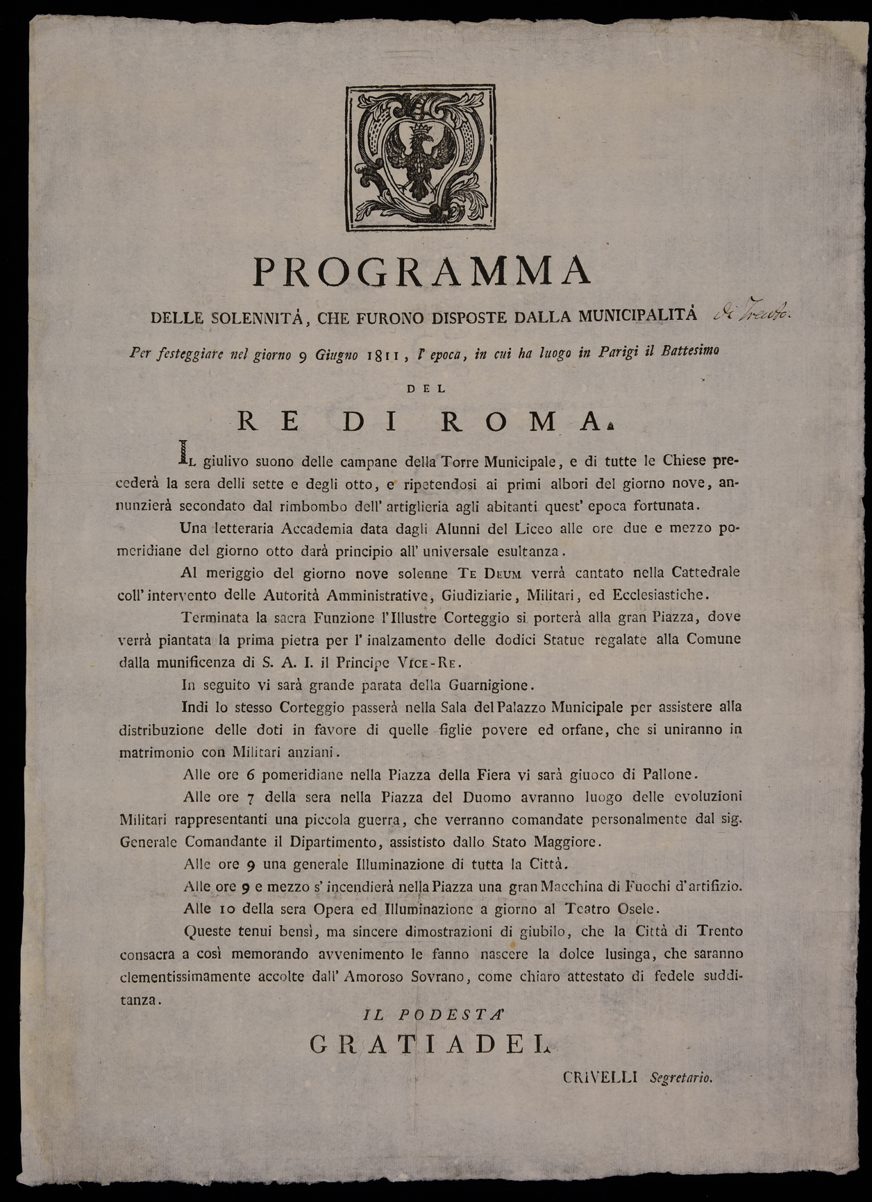 | Programma delle solennità che furono disposte dalla municipalità per festeggiare nel giorno 9 giugno 1811, l'epoca in cui ha luogo in Parigi il battesimo del re di Roma |