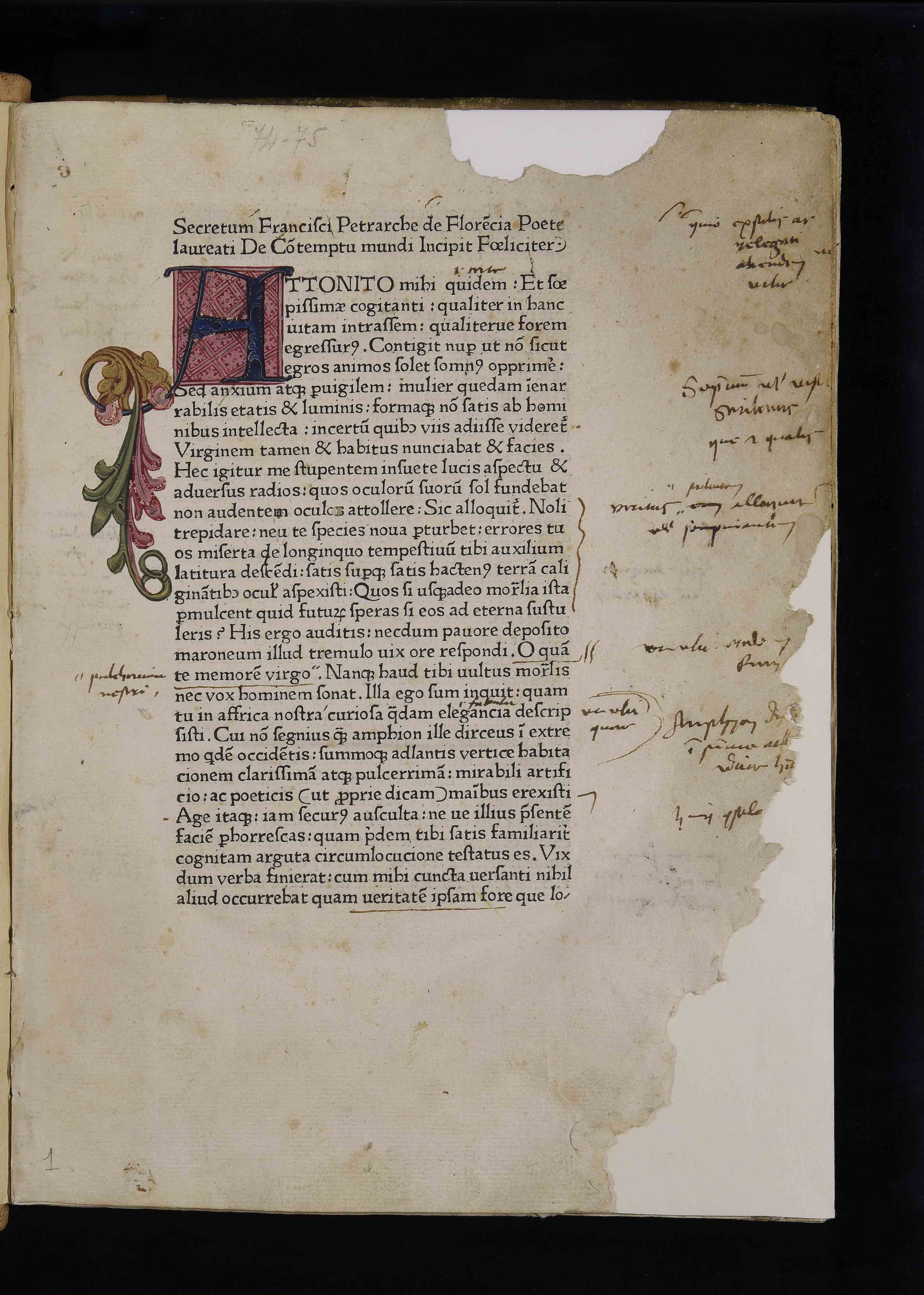 Legatura del XV sec., ultimo quarto, in piena pelle ovina su assi in legno, 295x475x55 mm; dorso rivestito nel sec. XIX in pelle; taglio con tracce di tintura in giallo, autore e titolo manoscritti sui tre tagli. Una iniziale ornata blu campita in viola con fregio marginale a volute (c. [12r]); iniziali semplici alternativamente in rosso e blu, segni paragrafali in rosso. Postille marginali di Johannes Hinderbach frequenti nelle prime 13 cc., segni d'attenzione e alcune brevi note marginali di altra mano (sec. XV) nel terzo libro; piccoli schizzi (teste, profili, mani di varie fogge, busti etc.) tracciati in inchiostro bruno-nerastro; tracce di segnatura manoscritta dei fascicoli. Mancano le cc. [11] e [110]. Legato in un volume fattizio composto da due opere . Precedenti segnature di collocazione: V 37, Inc. 74. Appartenuto al vescovo Johannes Hinderbach (cfr. Hinderbach 1989 , scheda 45) e alla Biblioteca vescovile (cfr. Hausbergher 2001 , scheda 282 e Incunaboli della Biblioteca comunale 2006 , scheda 363), il volume fu trasportato nel 1810 presso il Seminario vescovile e passò quindi alla Biblioteca comunale.