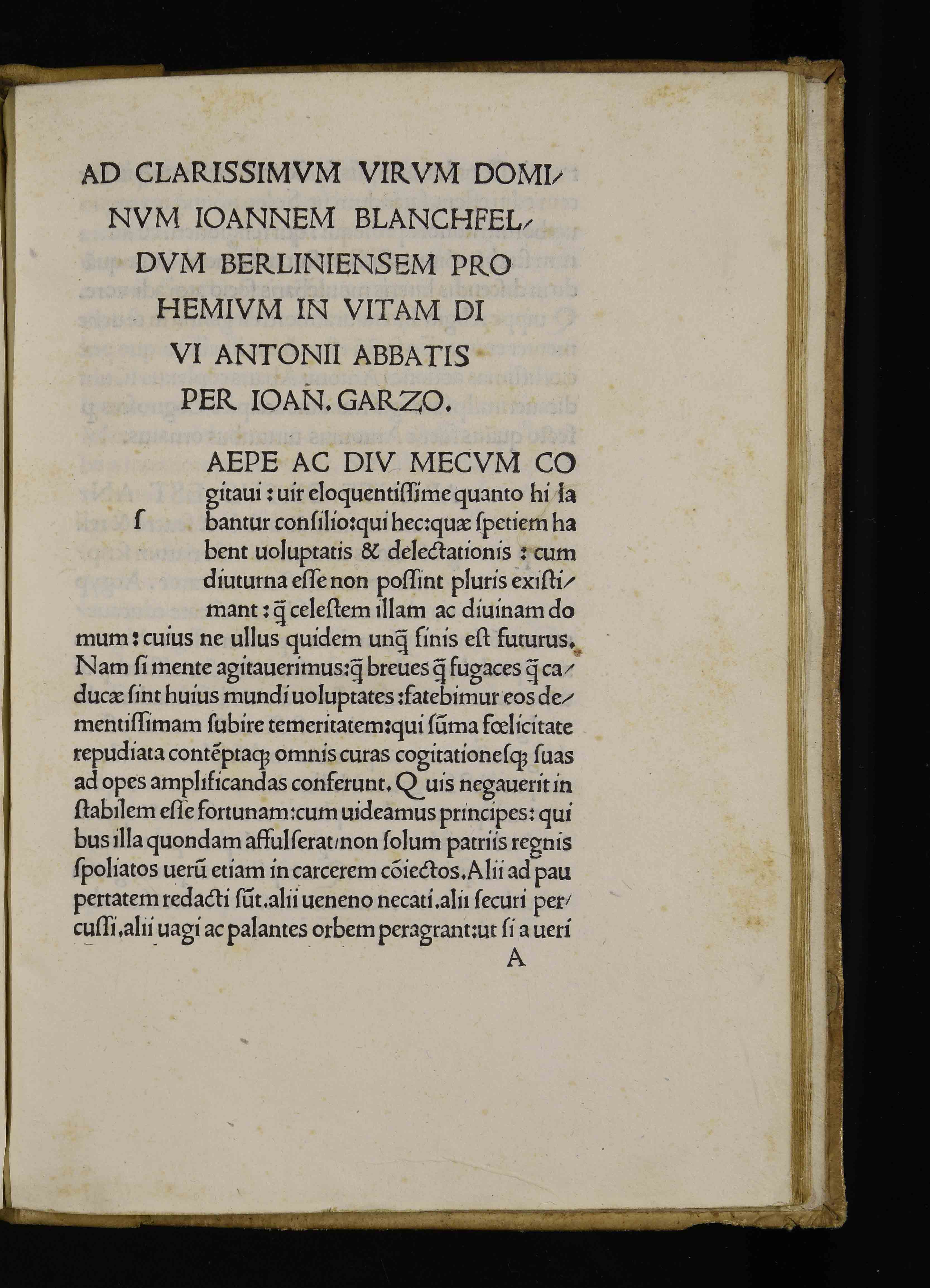 Legatura del XVI sec., primo quarto; legatura clesiana in piena pelle di porco su cartoni, 225x350x30 mm; dorso rifatto nel sec. XIX in pelle. Precedenti segnature di collocazione: I 42 g 24 poi 23, III 36, Inc. 563. Appartenuto al vescovo Bernardo Cles (cfr. Biblioteca del cardinale 1985 , scheda 142) e alla Biblioteca vescovile (cfr. Hausbergher 2001 , scheda 423 e Incunaboli della Biblioteca comunale 2006 , scheda 586), il volume fu trasportato nel 1810 presso il Seminario vescovile e passò quindi alla Biblioteca comunale. Legato in un volume fattizio composto da 3 opere , separate con carte di comodo con titoli manoscritti; il volume conteneva probabilmente anche un esemplare dell’opera di Giovanni Mattia Tiberino, Epigrammata aliaque carmina in beatum Simonem novum martyrem (Trento : [Giovanni Leonardo Longo], 5 settembre 1482), ora perduto.