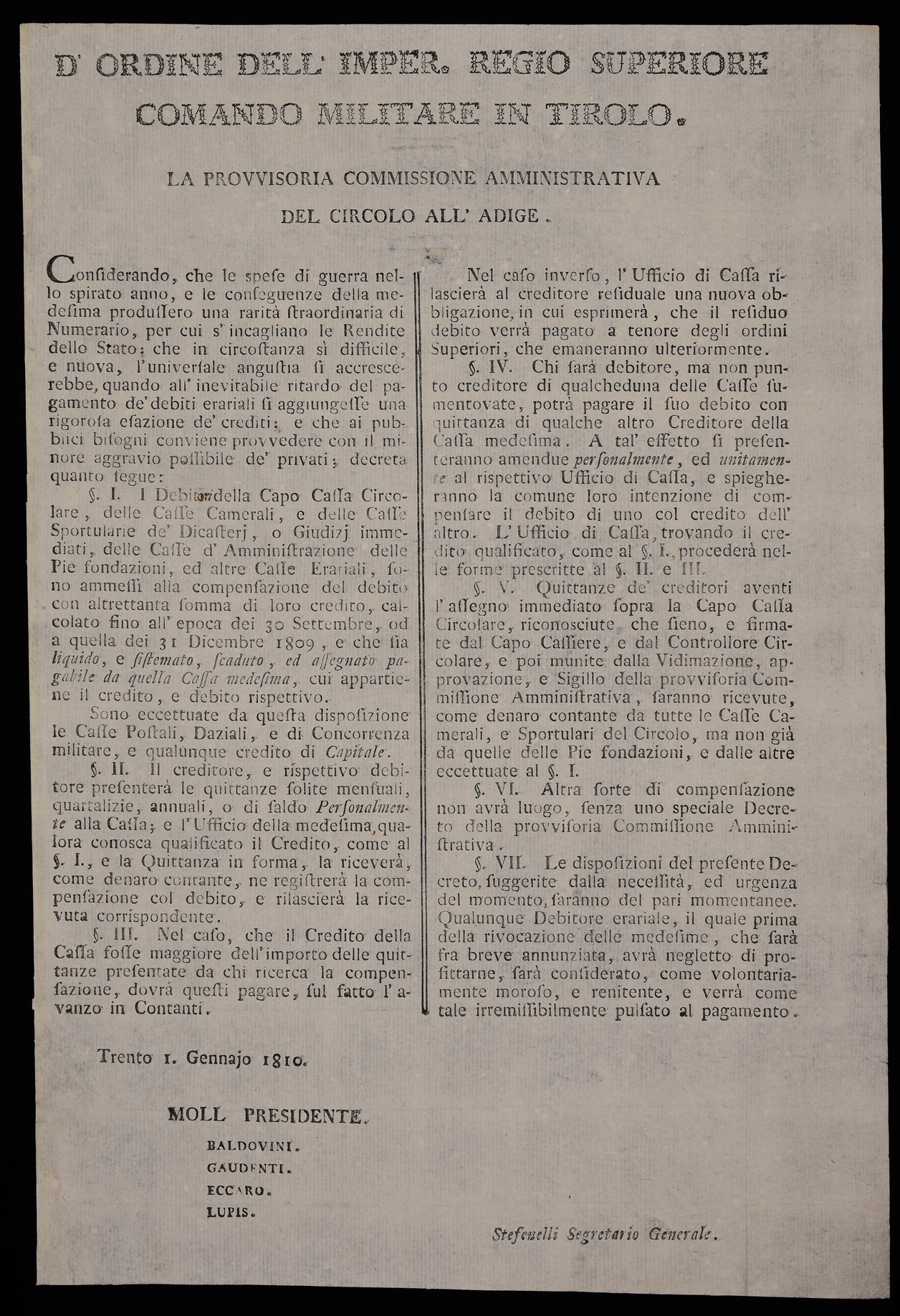 | D'ordine dell'Imp. Reg. Superiore Comando militare in Tirolo. La Provvisoria Commissione amministrativa del Circolo all'Adige |