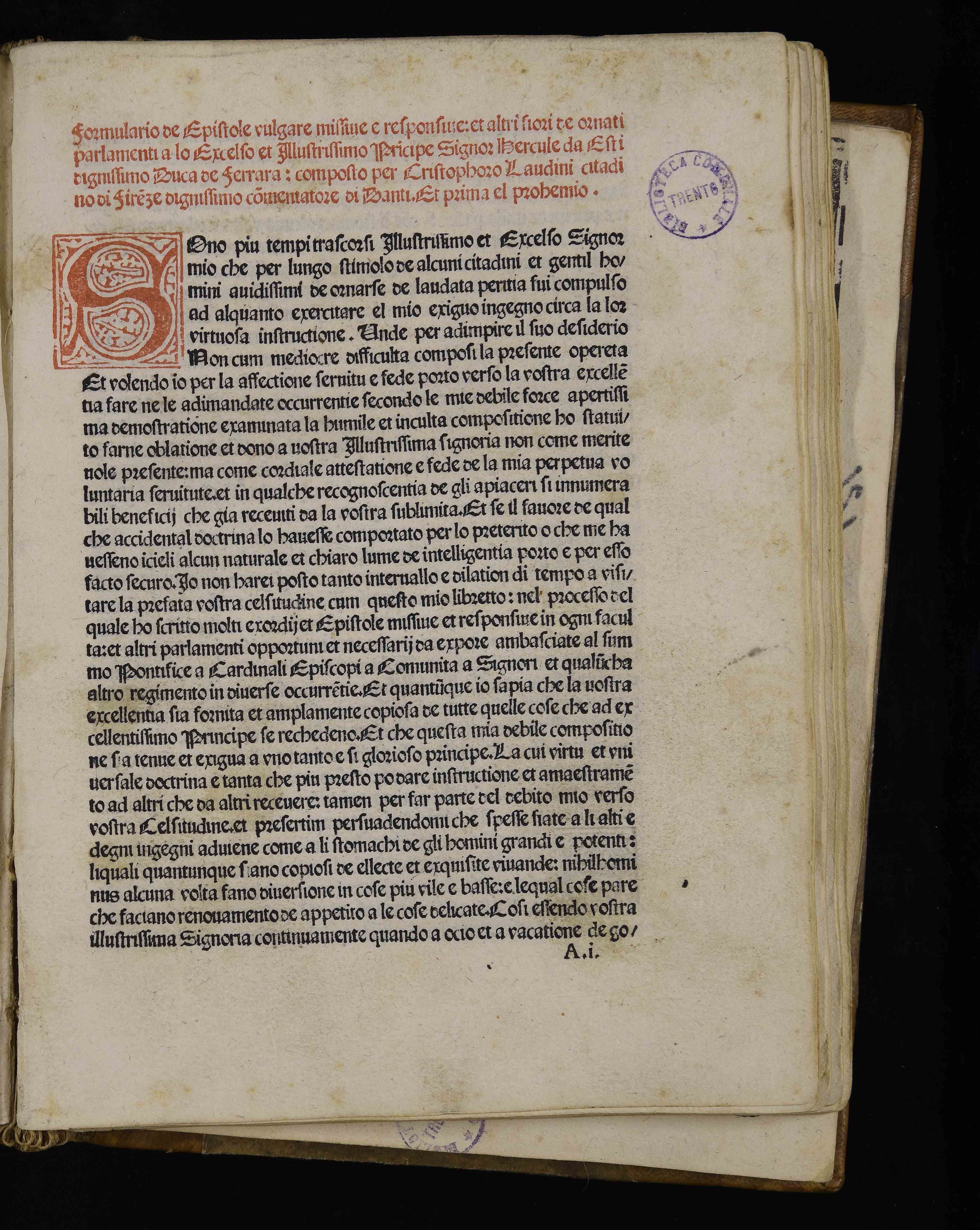 Legatura del XIX sec. in carta su cartoni, 215x360x50 mm; dorso e angoli in pelle. Sulla carta di guardia anteriore, nota di Bernardo Cles. Legato in un volume fattizio composto da 5 opere . Precedenti segnature di collocazione: I 45 e 1, Inc. 120. Appartenuto al vescovo Bernardo Cles (cfr. Biblioteca del cardinale 1985 , scheda 164) e alla Biblioteca vescovile (cfr. Hausbergher 2001 , scheda 221 e Incunaboli della Biblioteca comunale 2006 , scheda 279), il volume fu trasportato nel 1810 presso il Seminario vescovile e passò quindi alla Biblioteca comunale.