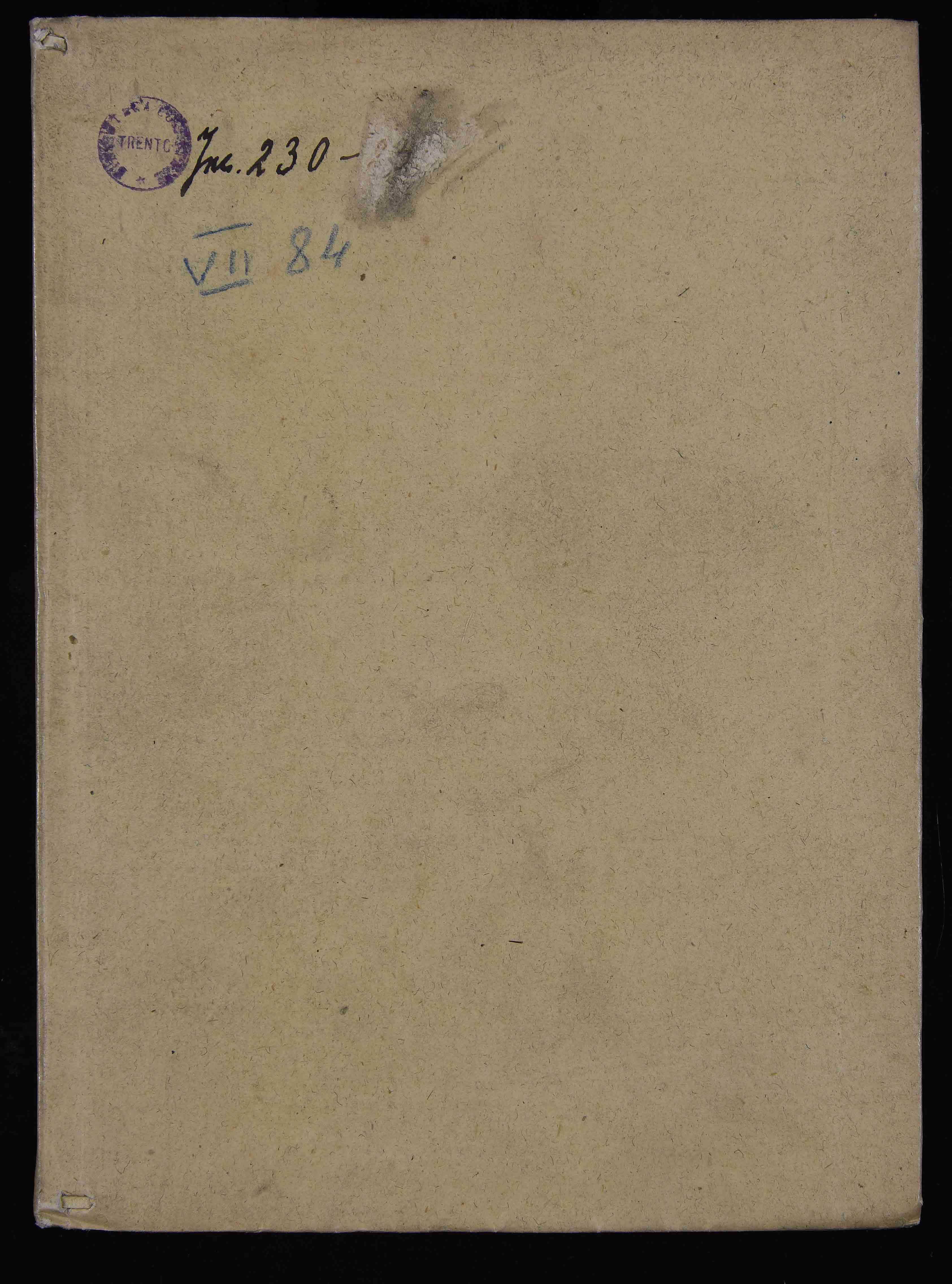 Legatura del XIX sec. in carta su cartoncino, 220x310x3 mm. Rari segni d'attenzione marginali e sottolineature; iniziali semplici, sottolineature e ritocchi delle maiuscole in rosso. Manca la c. a1 (bianca). Precedenti segnature di collocazione: Inc. 230, VII 84. Appartenuto alla Biblioteca vescovile di Trento (cfr. Hausbergher 2001 , scheda 353 e Incunaboli della Biblioteca comunale 2006 , scheda 493), il volume fu trasportato nel 1810 presso il Seminario vescovile e passò quindi alla Biblioteca comunale.