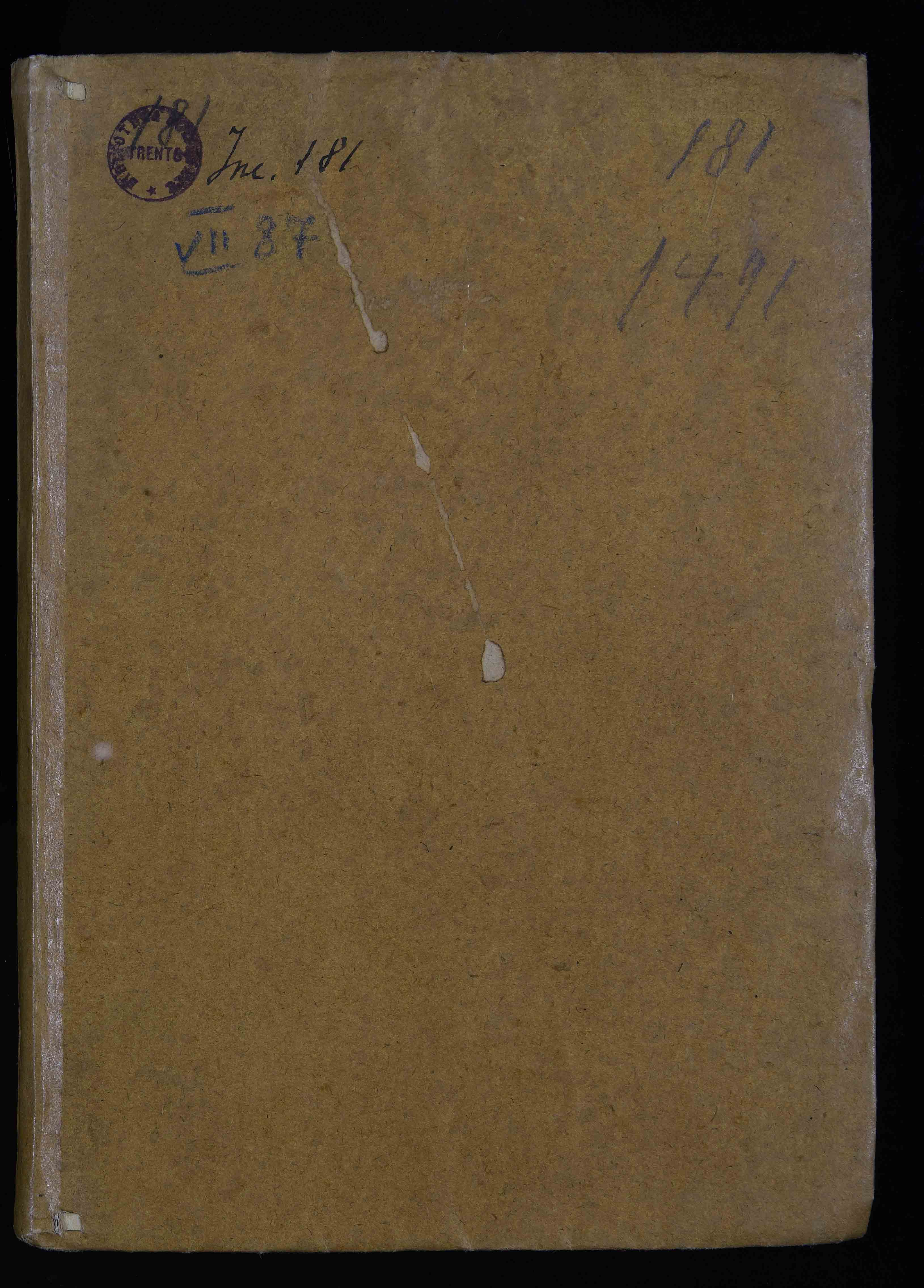 Legatura del XIX sec. in carta su cartoncino, 210x300x3 mm. A c. e4v corona disegnata a penna sovrastata dalla lettera E, quindi probabile nota di possesso depennata. Precedenti segnature di collocazione: Inc. 181, VII 87. Appartenuto alla Biblioteca vescovile di Trento (cfr. Hausbergher 2001 , scheda 124 e Incunaboli della Biblioteca comunale 2006 , scheda 456), il volume fu trasportato nel 1810 presso il Seminario vescovile e passò quindi alla Biblioteca comunale.