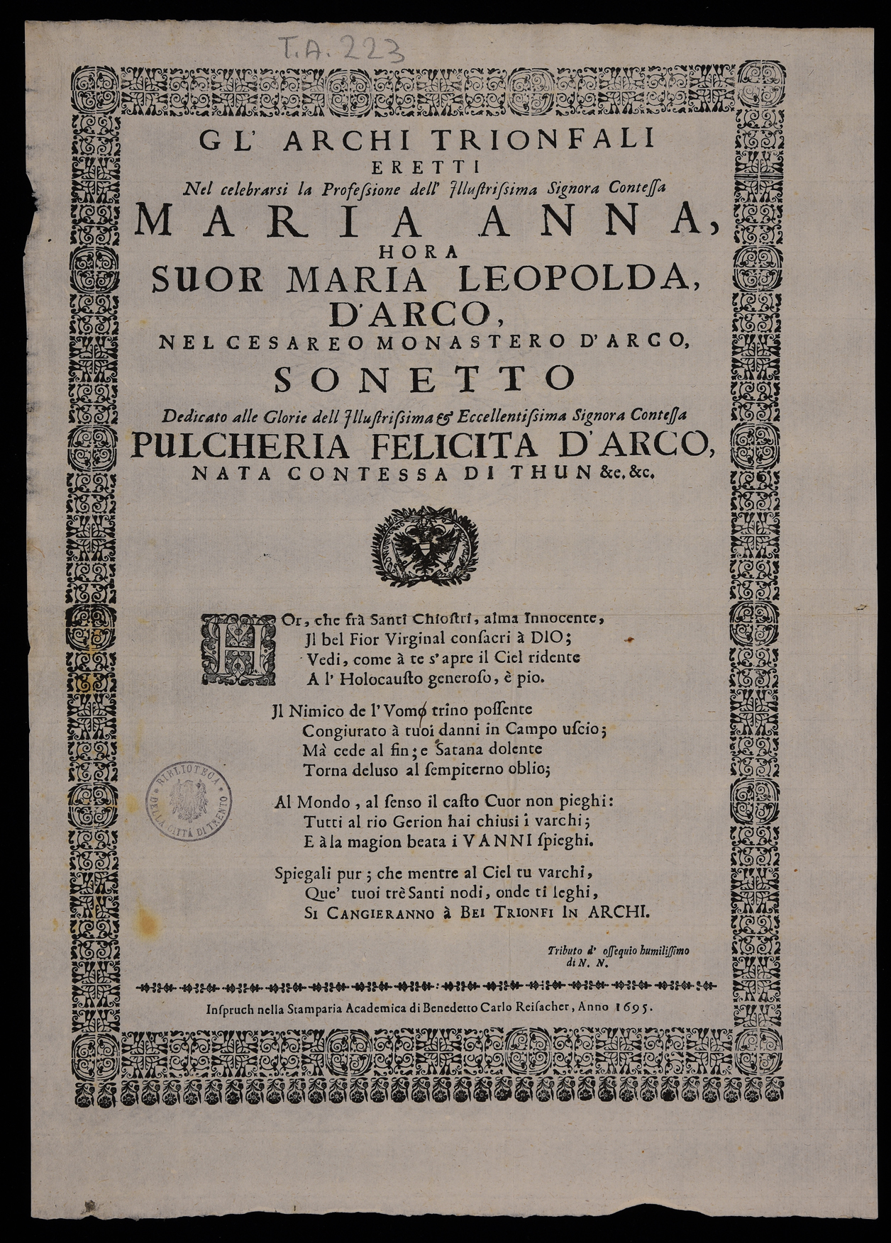 | Gl'archi trionfali eretti nel celebrarsi la professione dell'illustrissima signora contessa Maria Anna hora suor Maria Leopolda d'Arco nel cesareo monastero d'Arco, sonetto ... |