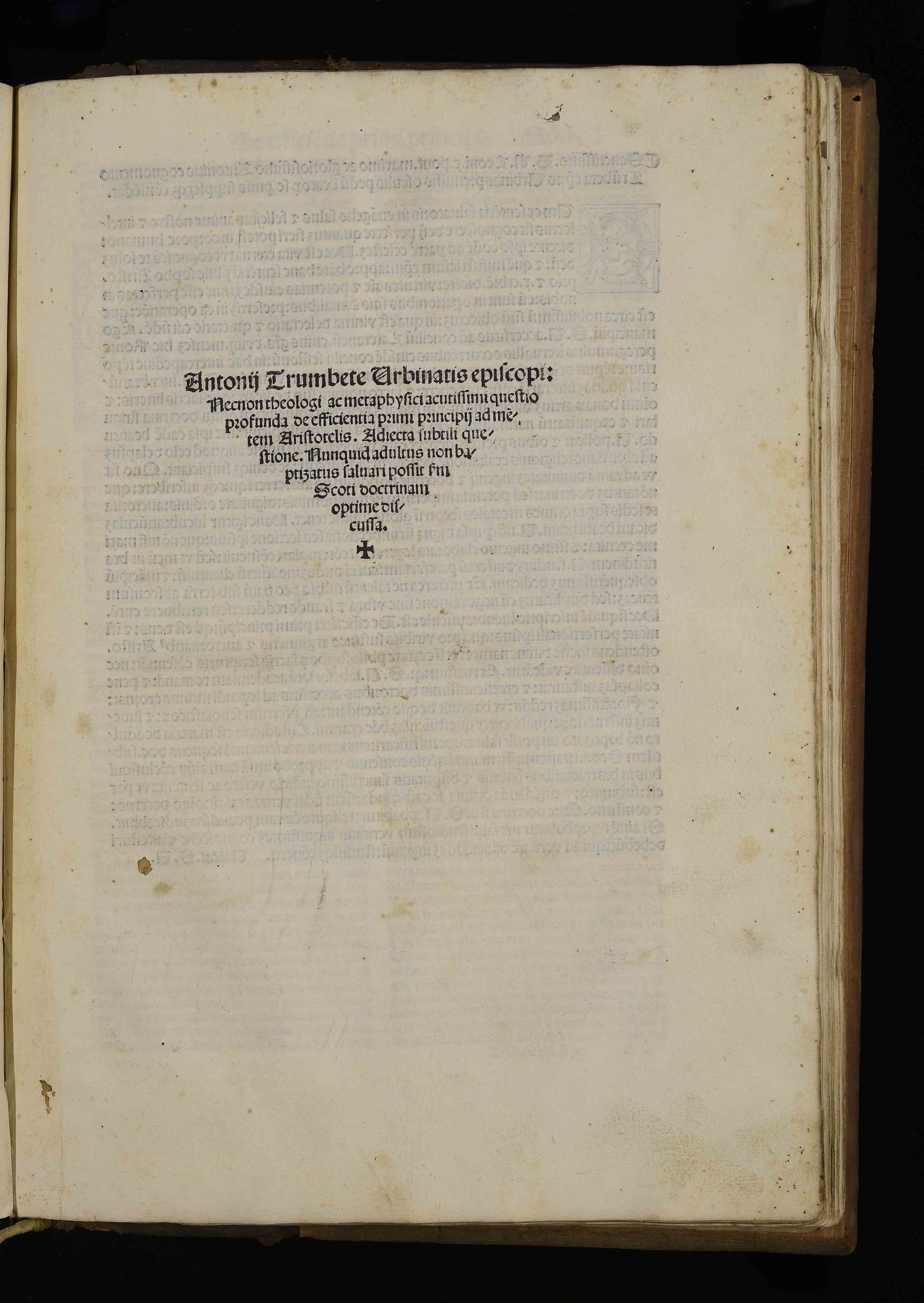 Legatura del XVI sec., primo quarto, in mezza pelle su assi in legno, 320x480x45 mm. Dorso titolato (?). Sul recto della prima carta di guardia anteriore nota manoscritta relativa all’opera; altre note sulla seconda carta di guardia posteriore. Precedenti segnature di collocazione: I 40 d 12, 233 b 21, Inc. 619, C 13 H 8. Legato in un volume fattizio composto da 4 opere . Appartenuto alla Biblioteca vescovile di Trento (cfr. Incunaboli della Biblioteca comunale 2006 , scheda 642), il volume fu trasportato nel 1810 presso il Seminario vescovile e passò quindi alla Biblioteca comunale.