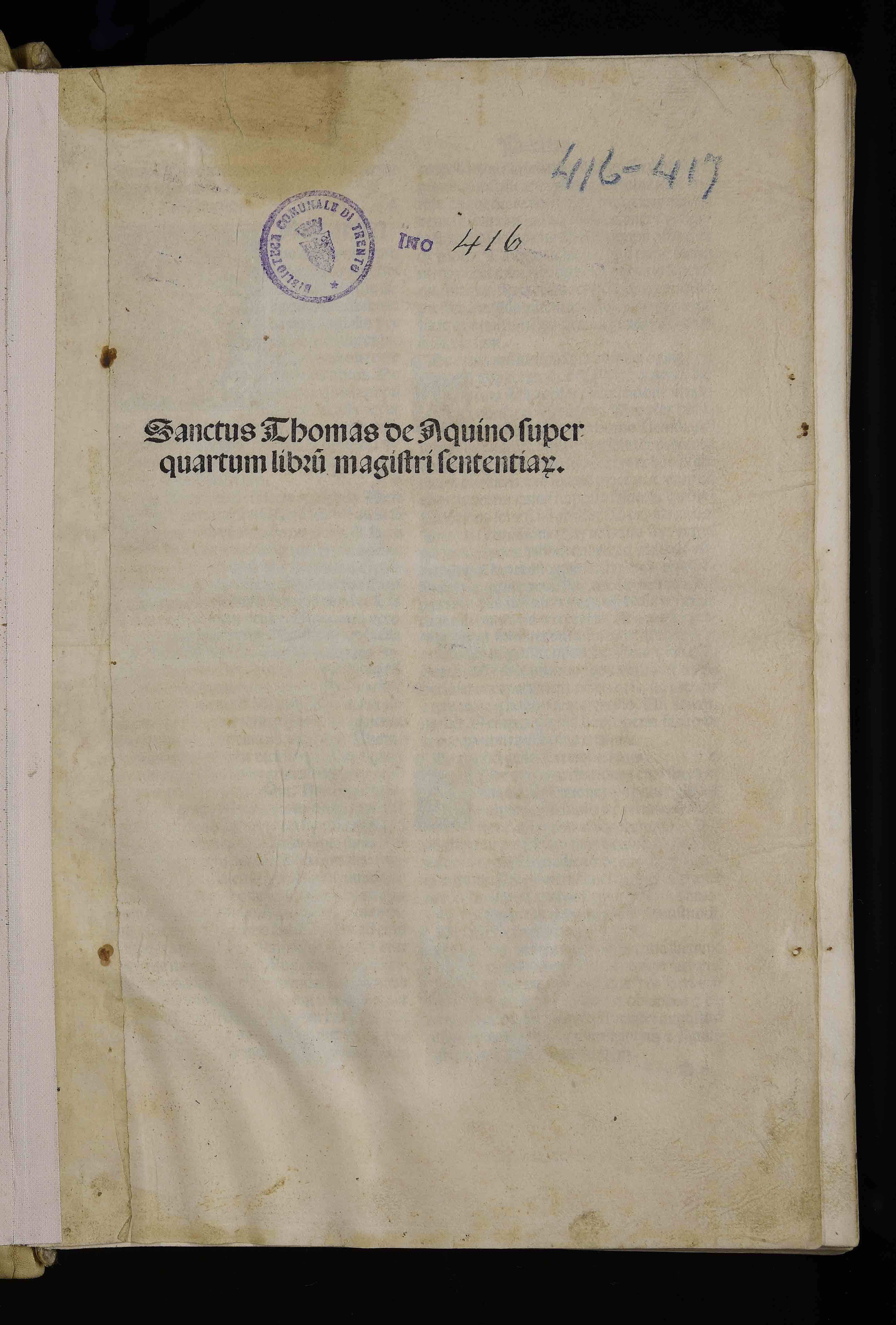 Tracce di una legatura del XVI sec., primo quarto, in mezza pelle su assi in legno, 340x520x75 mm; la pelle originaria del dorso è stata asportata completamente (probabilmente era simile a quella di G 1 c 66) e il dorso è stato rifatto nel sec. XIX in pelle di vitello. Titolo e autore manoscritti sul piatto posteriore. Rarissimi segni di attenzione nelle prime carte. Legato in un volume fattizio composto da 2 opere . Appartenuto alla Biblioteca vescovile di Trento (cfr. Hausbergher 2001 , scheda 348 e Incunaboli della Biblioteca comunale 2006 , scheda 486), il volume fu trasportato nel 1810 presso il Seminario vescovile e passò quindi alla Biblioteca comunale (collocazioni: I 40 d 2, Inc. 416, VII 11).