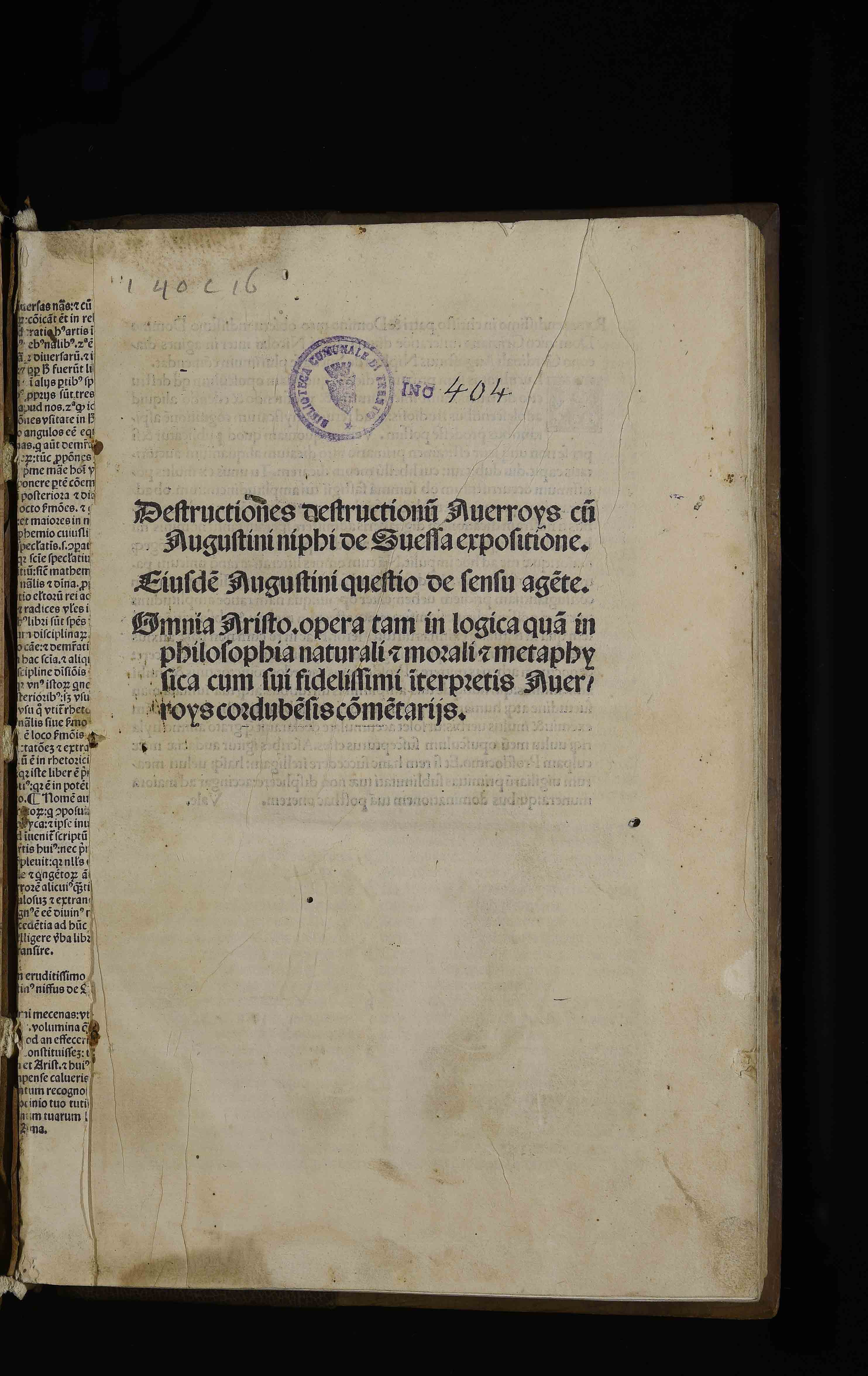 130 cc.; fol.: a-p8 q10 [$4 segnate (-a1; +q5); bianca q10]. Contiene anche De sensu agente di Agostino Nifo. A c. a1v, lettera di dedica di Agostino Nifo a a Domenico Grimani, cardinale e presbitero di San Nicola fra le Immagini (non datata).