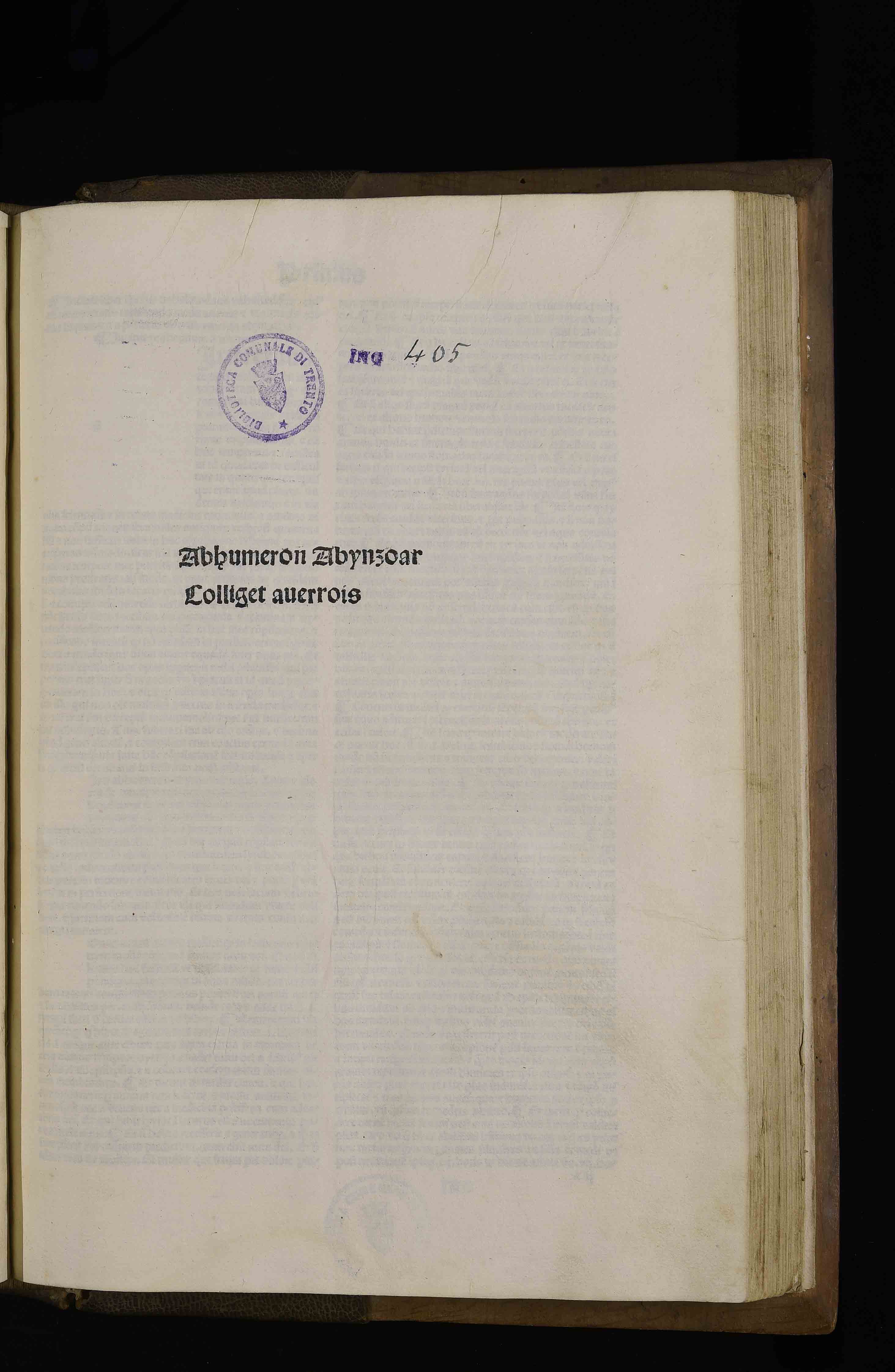 Legatura del XVI sec., primo quarto, in mezza pelle su assi in legno, 300x490x55 mm; titolo e autore manoscritti sul piatto posteriore. Rarissime postille. Legato in un volume fattizio composto da 2 opere . Precedenti segnature di collocazione: I 40 c 16, Inc. 405, VII 13. Appartenuto alla Biblioteca vescovile di Trento (cfr. Hausbergher 2001 , scheda 37 e Incunaboli della Biblioteca comunale 2006 , scheda 34), il volume fu trasportato nel 1810 presso il Seminario vescovile e passò quindi alla Biblioteca comunale.