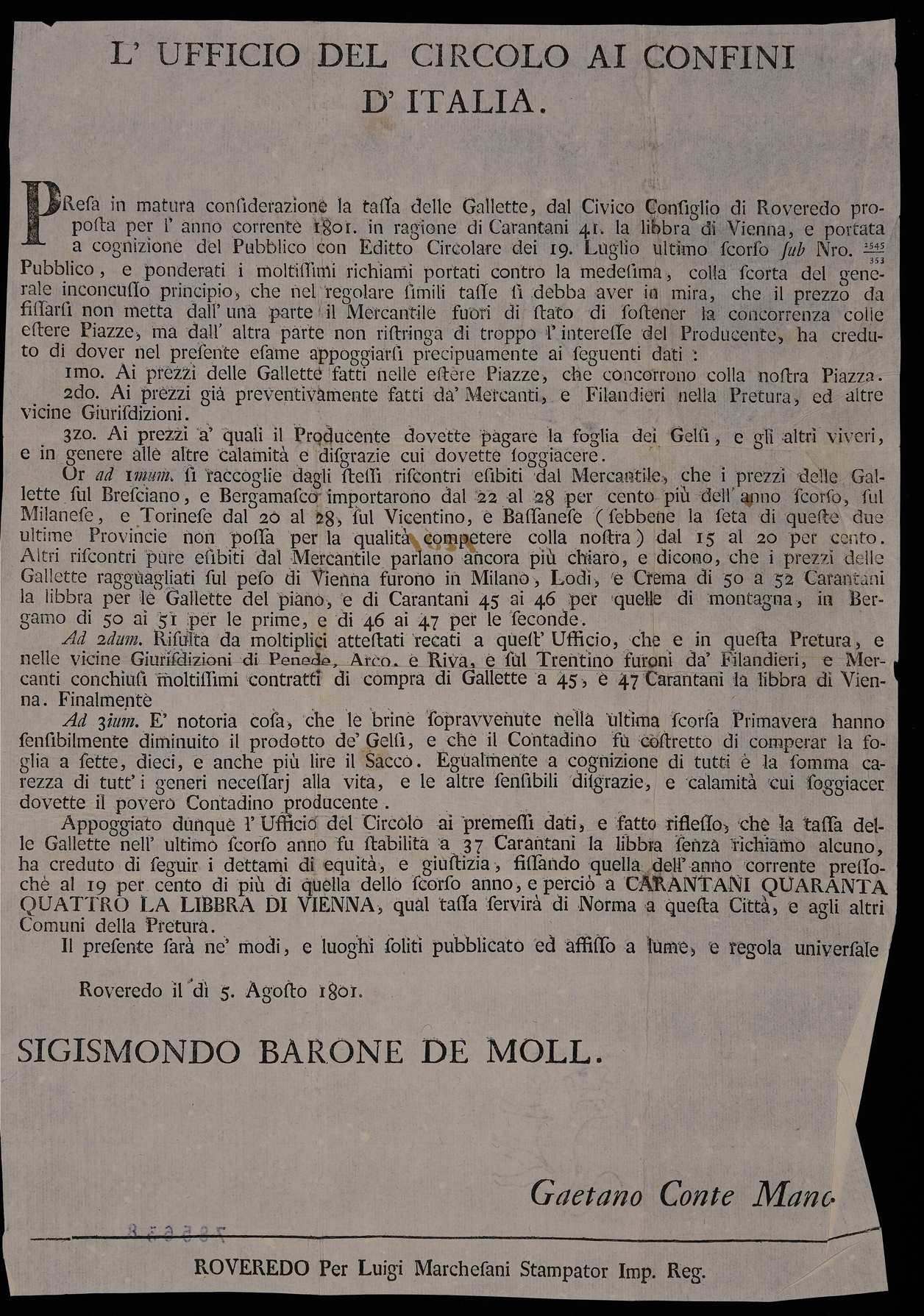 Presa in matura considerazione la tassa delle gallette, dal Civico Consiglio di Roveredo proposta per l'anno corrente 1801, in ragione di carantani 41 la libbra di Vienna, e portata a cognizione ...