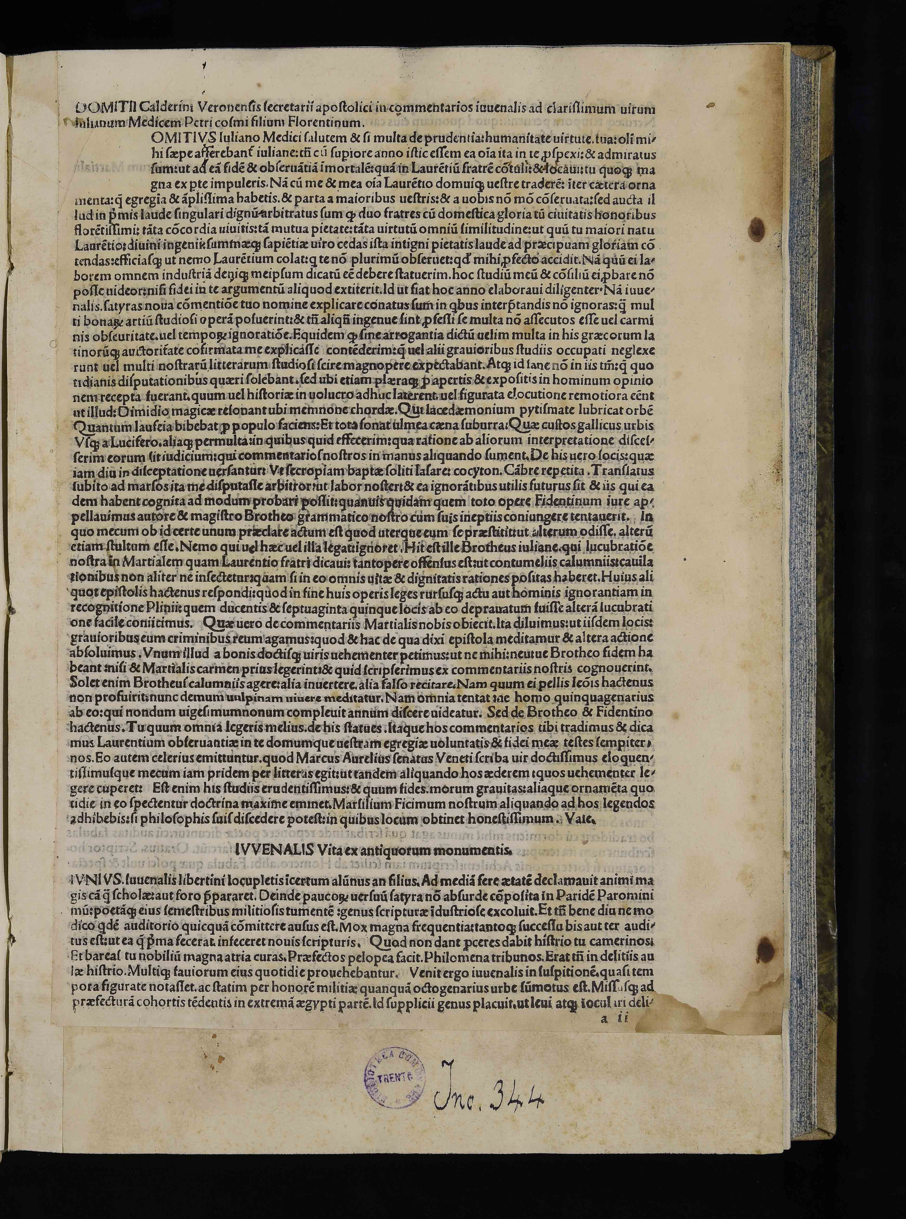 120 cc.; fol.: a4 b-t6 u8 [$3 segnate (-a1, a3; +u4); bianche a1 e u8]. Con il commento di Domizio Calderini e Giorgio Valla. Contiene anche: Defensio adversus Brotheum di Domizio Calderini.