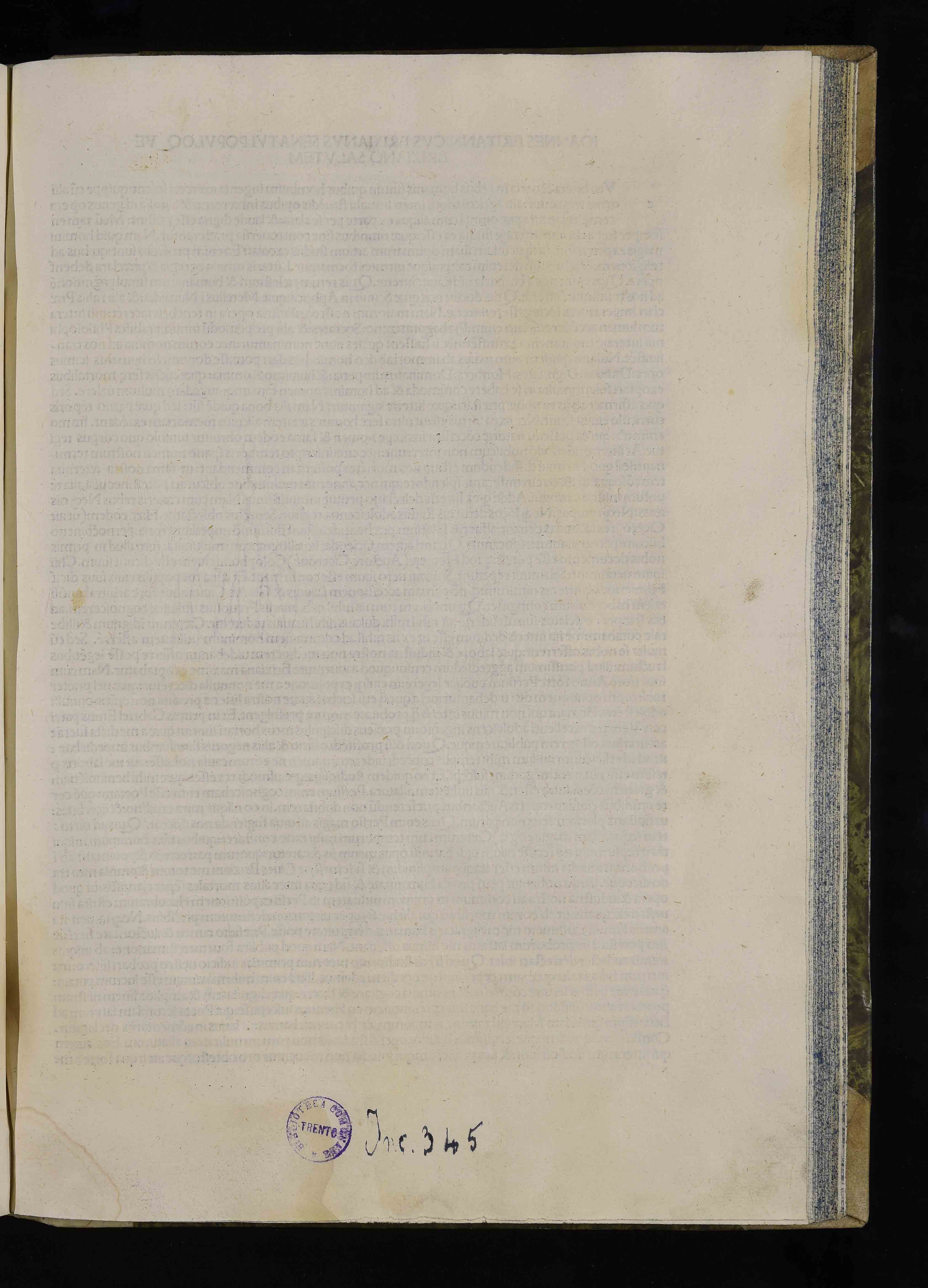 Legatura del XIX sec., seconda metà, in carta su cartoni, 310x475x30 mm; rinforzi in pergamena agli angoli e sul dorso; titolo, autore e data di stampa manoscritti sul dorso. Alcune postille marginali di Bernardo Cles e di altra mano, parzialmente asportate dalla rifilatura; alcuni segni d'attenzione. Legato in un volume fattizio composto da 2 opere . Precedenti segnature di collocazione: I 40 c 8, Inc. 345, V 35. Appartenuto al vescovo Bernardo Cles (cfr. Biblioteca del cardinale 1985 , scheda 206) e alla Biblioteca vescovile (cfr. Hausbergher 2001 , scheda 281 e Incunaboli della Biblioteca comunale 2006 , scheda 361), il volume fu trasportato nel 1810 presso il Seminario vescovile e passò quindi alla Biblioteca comunale.