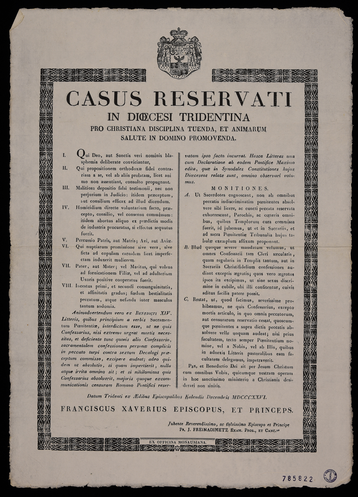 | Casus reservati. In dioecesi tridentina pro christiana disciplina tuenda, et animarum salute in Domino promovenda |