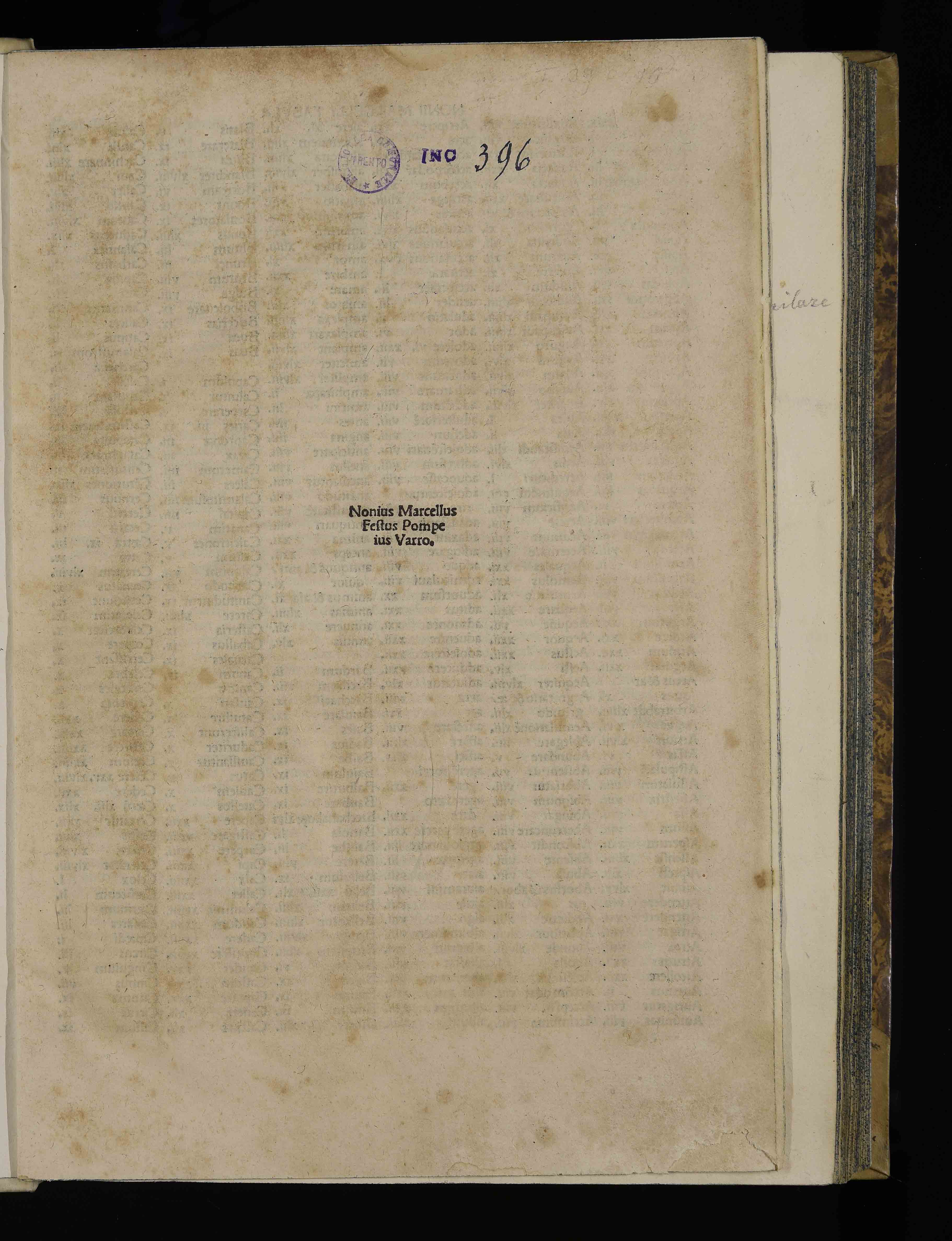104 cc.; fol.: 2a6 a-h6 i4 k-q6 r4 [$3 segnate (-2a1, i3, r3); bianca r4]. A cura di Pomponius Laetus e Franciscus Rolandellus. Contiene anche: De verborum significatione di Sextus Pompeus Festus; De lingua latina di Marcus Terentius Varro.