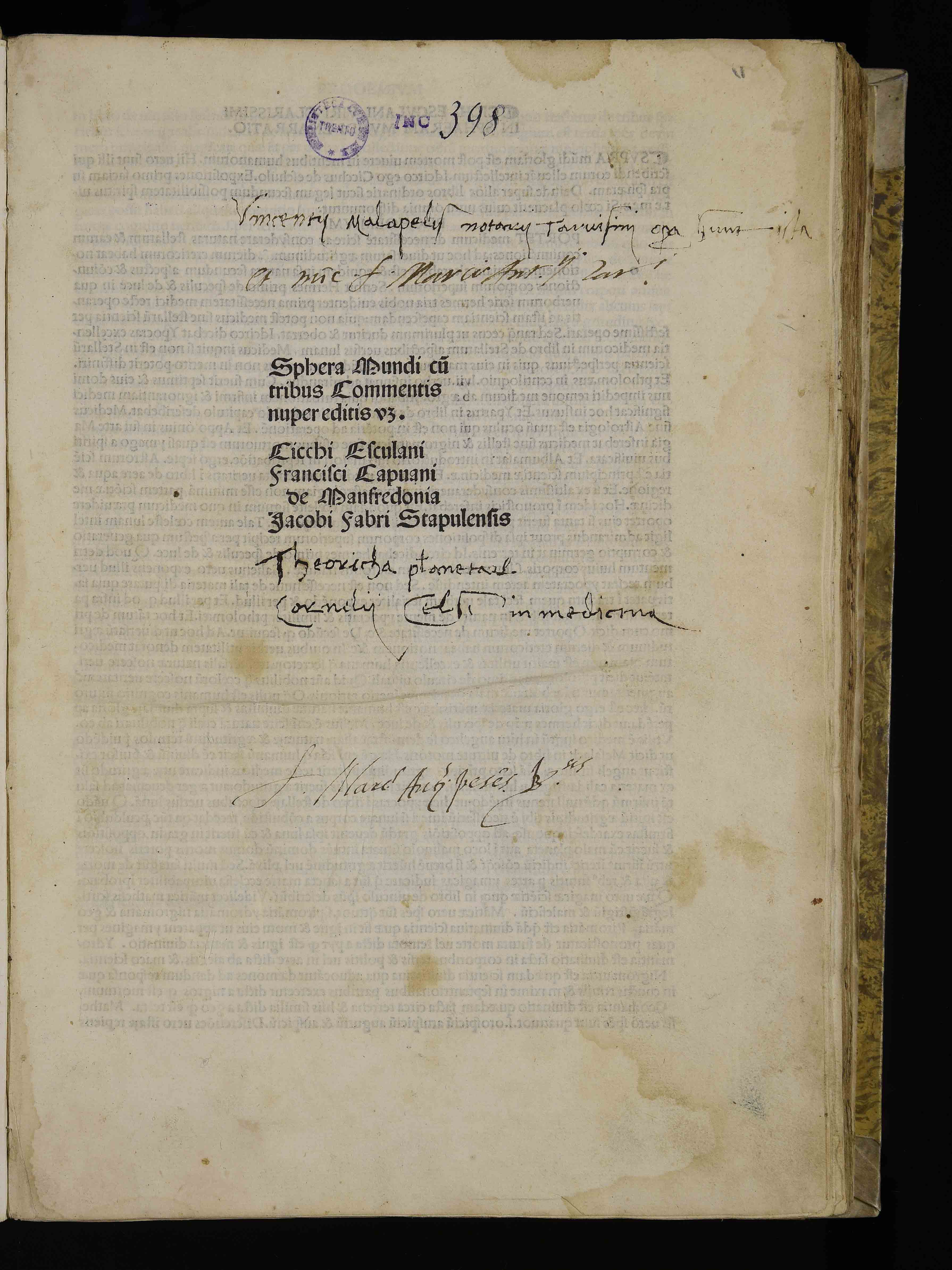 Legatura del XIX sec., prima metà, in carta su cartoni, 315x490x40 mm; rinforzi in pergamena agli angoli e sul dorso. Titolo, autore e data di stampa incisi in oro su tassello; titolo manoscritto sul taglio davanti. Sul frontespizio, note di possesso ms. di Vincentius Malapelus, notaio trevigiano, Marco Antonio Corsi e Marco Antonio Pesenti e titolo manoscritto. Diverse postille e segni di attenzione. Il fascicolo m6 è composto da 8 carte, in quanto si trovano rilegati due fogli uguali m3-4. Precedenti segnature di collocazione: I 29 b 13, Inc. 398, V 32. Legato in un volume fattizio composto da 2 opere . Appartenuto alla Biblioteca del Convento di San Francesco di Trento (cfr. Borzatti , p. 111), il volume fu trasportato nel 1810 presso il Seminario vescovile e passò quindi alla Biblioteca comunale.