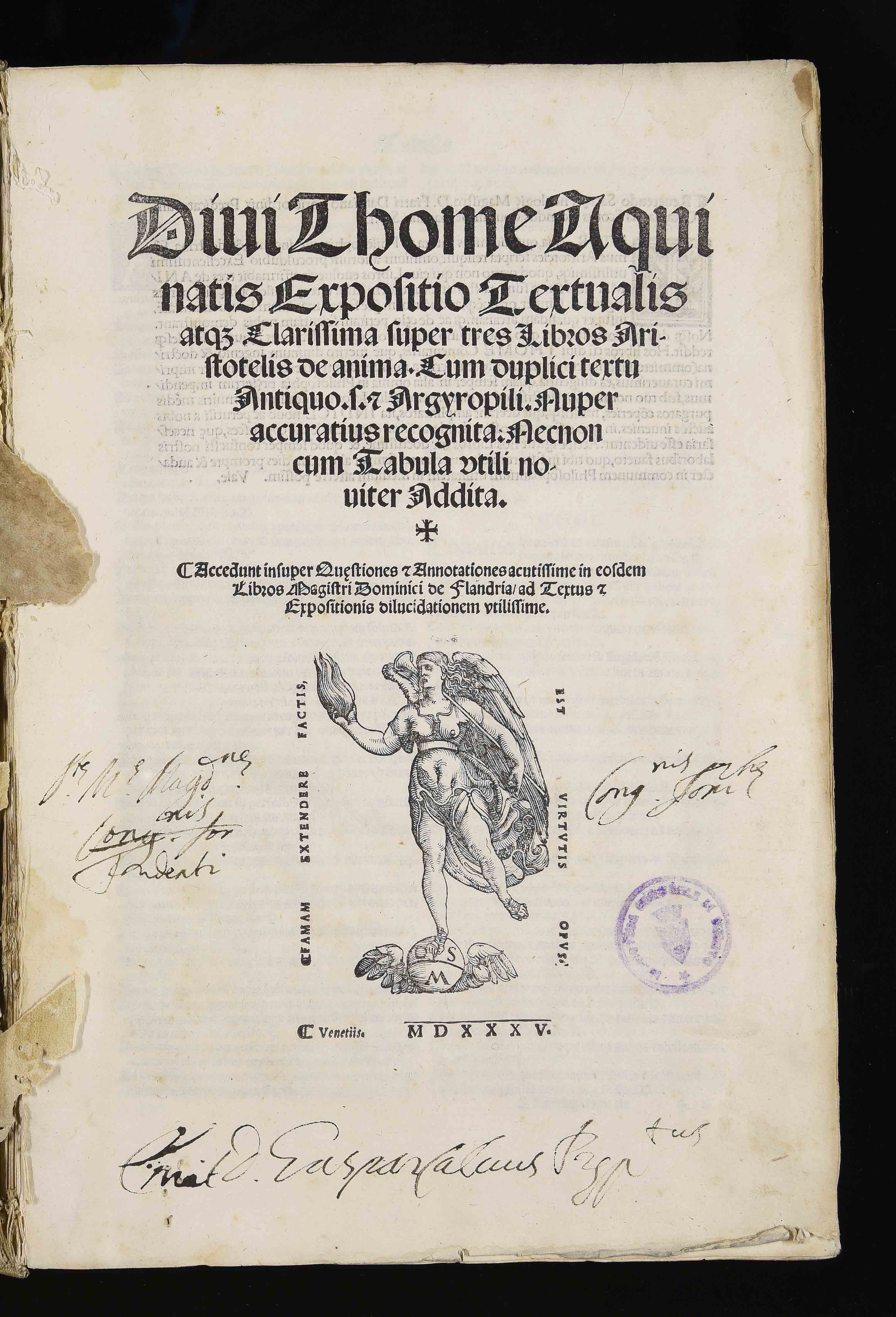 | Divi Thome Aquinatis Expositio textualis atque clarissima super tres libros Aristotelis de anima. Cum duplici textu antiquo s. et Argyropyli. Nuper accuratius recognita. Necnon cum tabula utili noviter addita. Accedunt insuper questiones et annotationes acutissime in eosdem libros magistri Dominici de Flandria ad textus et expositionis dilucidationem utilissime |
