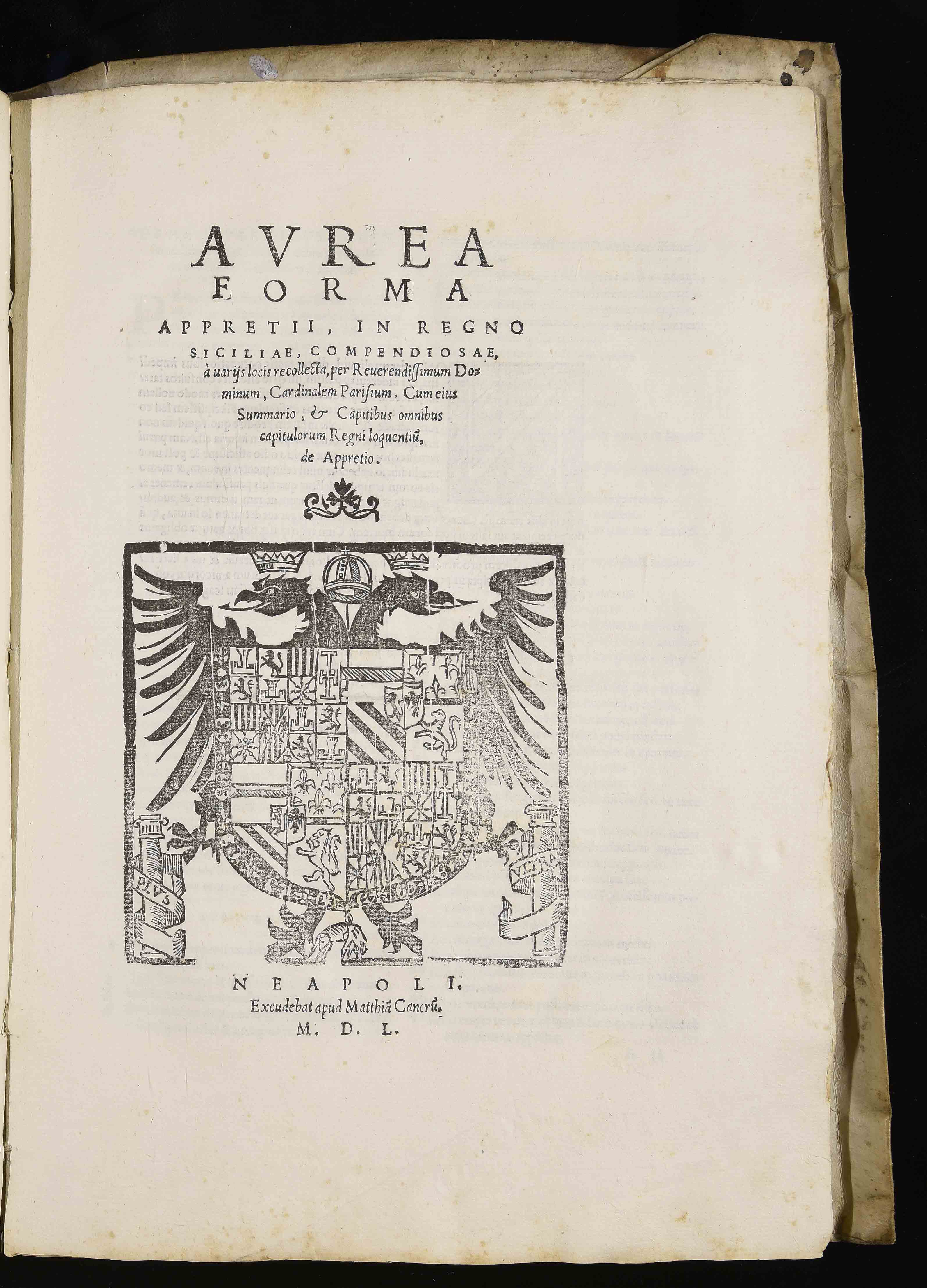 | Aurea forma appretii, in regno Siciliae, compendiosae, a variis locis recollecta, per reverendissimum dominum, cardinalem Parisium. Cum eius summario, et capitibus omnibus capitulorum regni loquentium, de appretio |