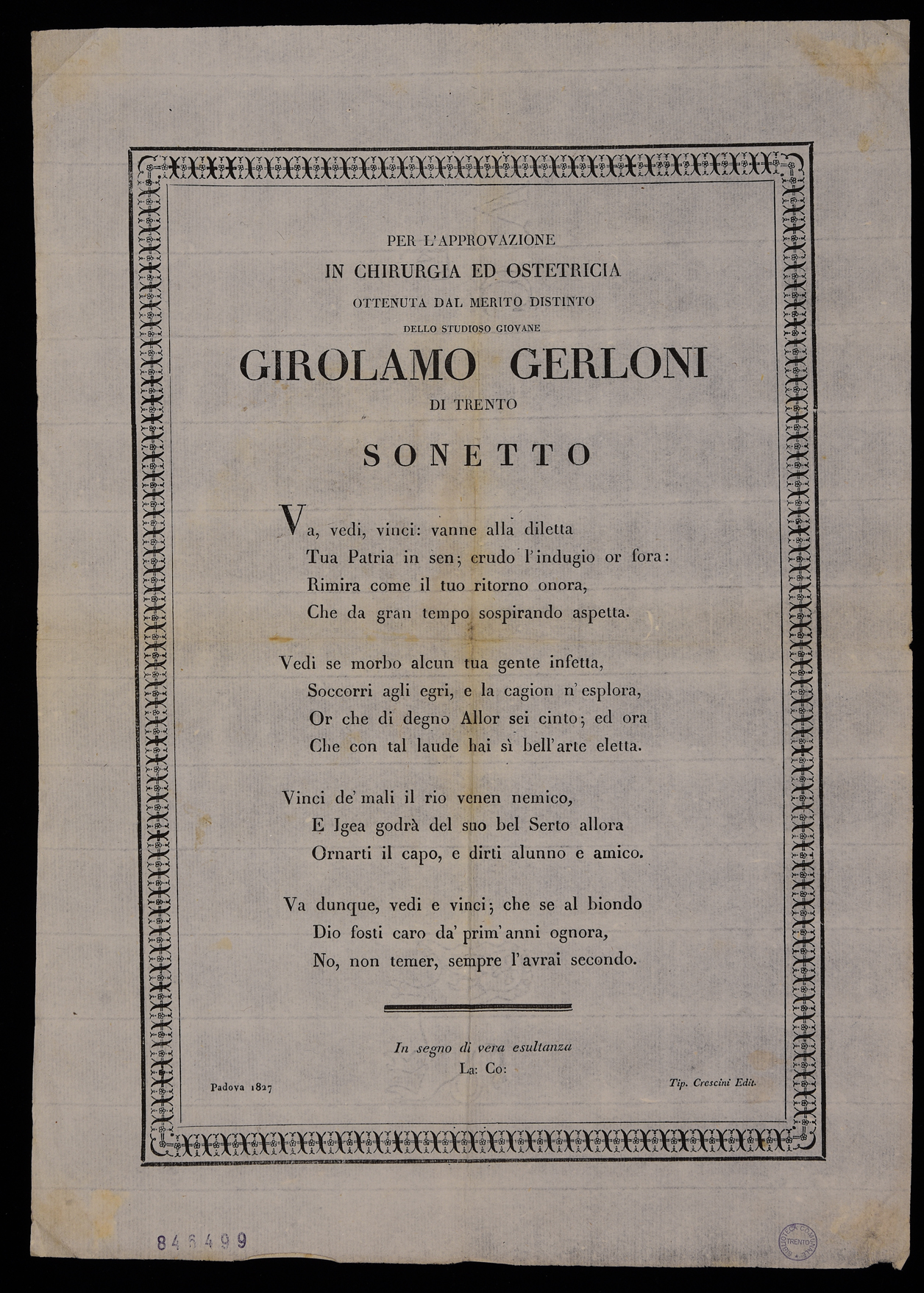 | Per l'approvazione in chirurgia ed ostetricia ottenuta dal merito distinto dello studioso giovane Girolamo Gerloni di Trento, sonetto |