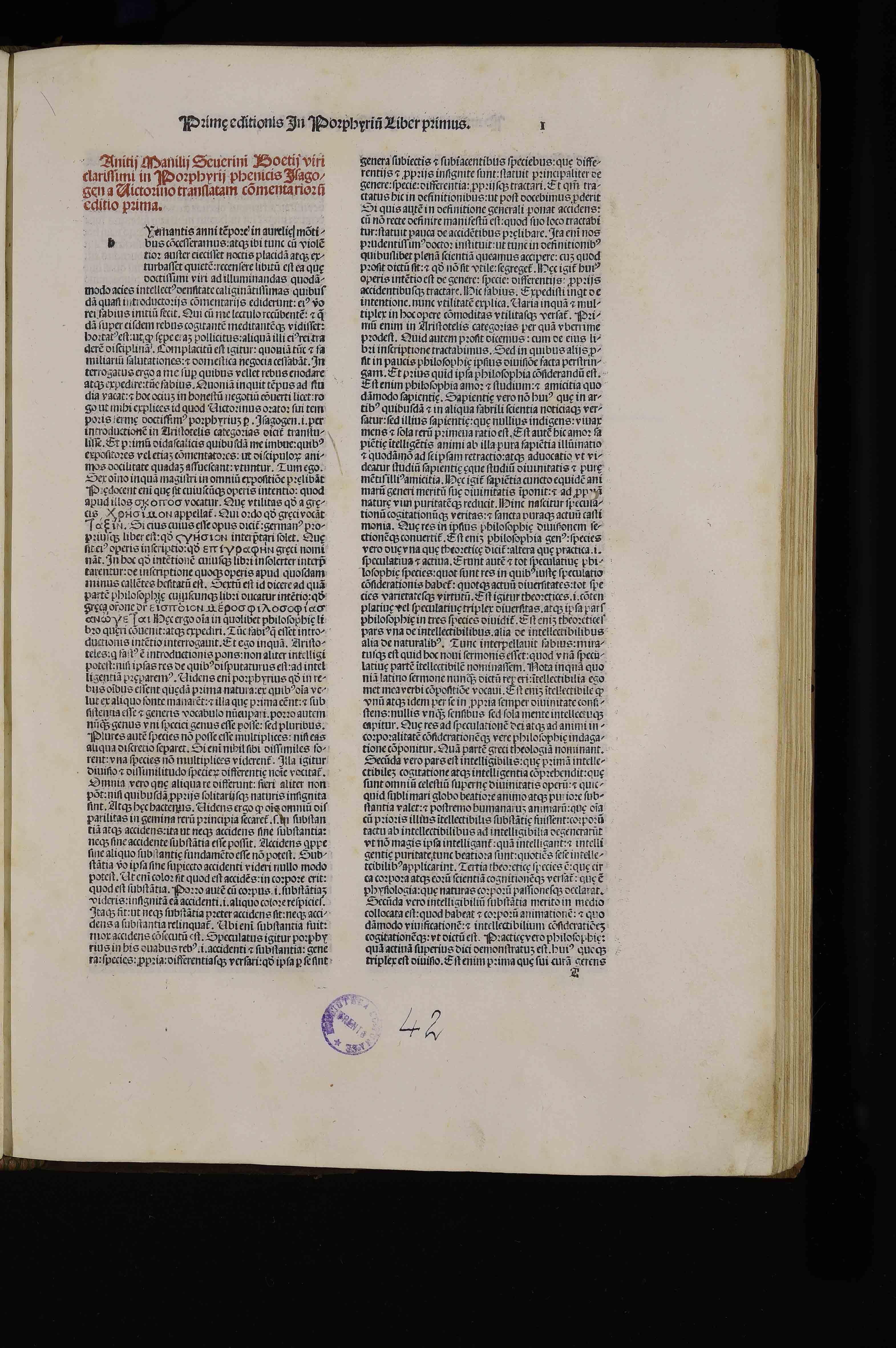 122 cc.; fol.: A-B6 a8 b10 c-d8 e-f6 g4 h6 i8 k-q6 r4 [bianche B6v, b10v, f6v, r4]. Note tipografiche da ISTC ib00767000 . In due parti, datate: 1) 18 agosto 1492; 2) 26 marzo 1491. Contiene: In Porphyrii Isagogen editio prima et secunda; In Praedicamenta Aristotelis; In librum Aristotelis Perihermenias editio prima et secunda; De divisionibus; Introductio ad categoricos syllogismos; De differentiis topicis, Commentaria in Topica Ciceronis; De syllogismo categorico; De syllogismo hypothetico; Opuscula sacra; De arithmetica; De musica; De consolatione philosophiae con il commento di <pseudo> san Tommaso d’Aquino. Contiene anche: De geometria [II e I]; De disciplina scholarium di <pseudo> Boezio (quest’ultimo con il commento di <pseudo> san Tommaso d’Aquino); De definitionibus [1-3] di Gaius Marius Victorinus).