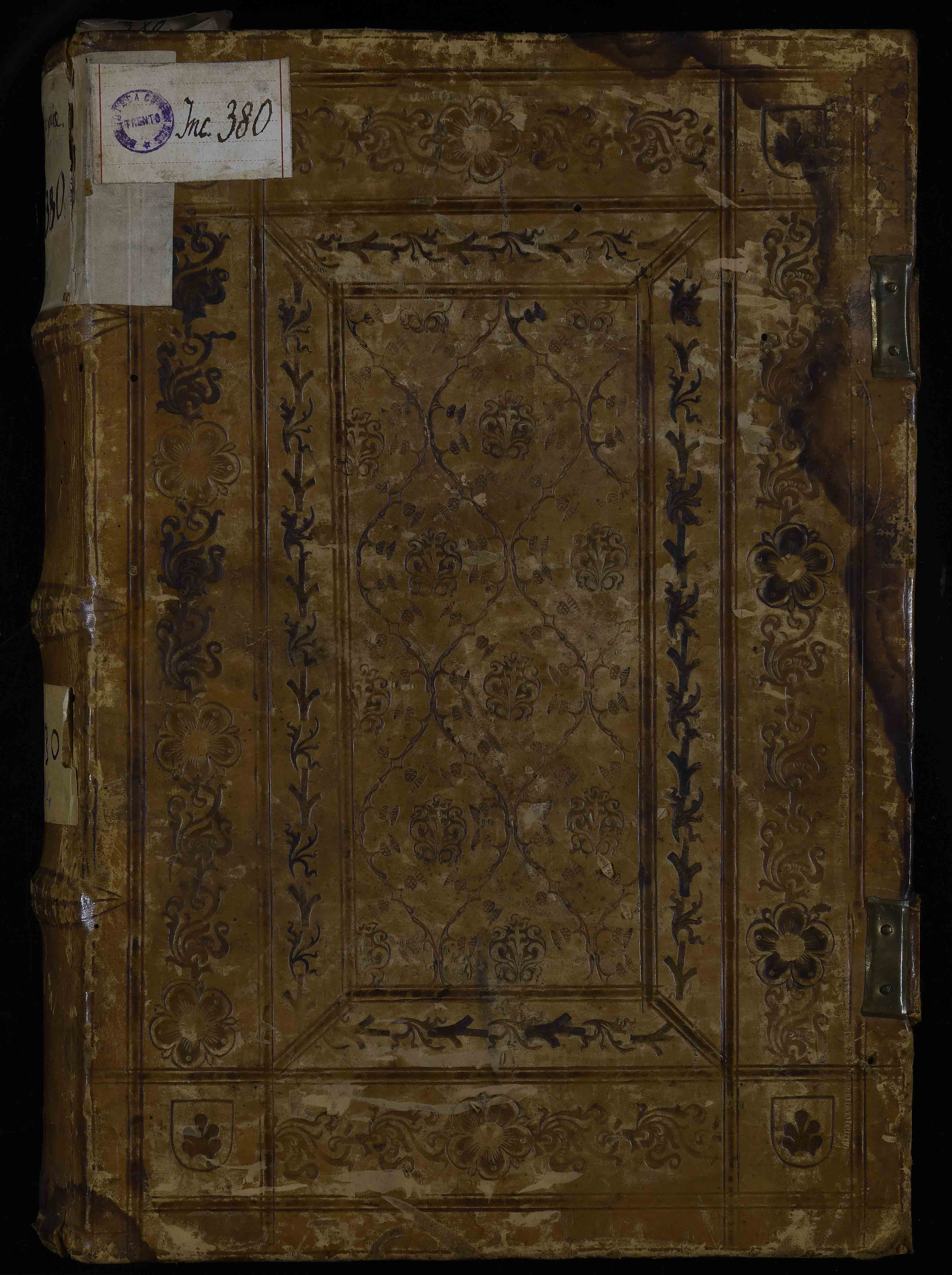 Legatura del XV sec., ultimo quarto, alle armi della famiglia Frundsberg, in piena pelle su assi con impressioni, 325x510x70 mm; titolo e data di stampa manoscritti su cartiglio e sul taglio di piede. Frammento membranaceo manoscritto in ebraico utilizzato come rinforzo tra la controguardia e la carta di guardia anteriore; frammento di documento episcopale riconducibile alla cancelleria di Ulrich Frundsberg tra c. N6 e O1. La c. O6 è stata inconllata sul piatto posteriore. Precedenti segnature di collocazione: I 40 e 2, Inc. 380, V 14.