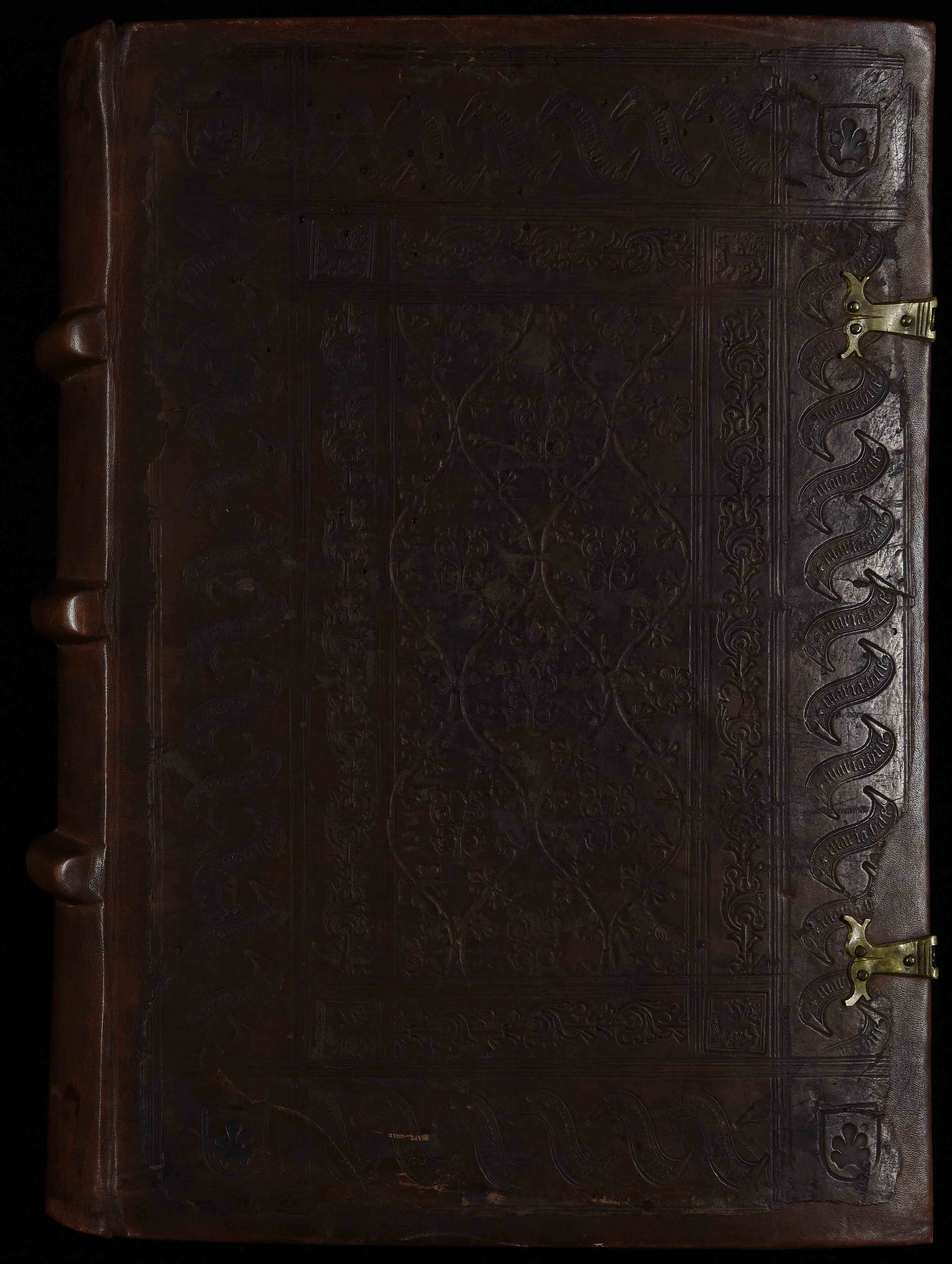 Tracce di una legatura del XV sec., ultimo quarto, in piena pelle su assi con impressioni, alle armi della famiglia Frundsberg, 330x530x85 mm.; l’intervento di restauro ha innestato frammenti della pelle della legatura primaria su una legatura in pelle di vitello, sostituendo le assi primarie con cartoni e sostituendo guardie e controguardie; restauro effettuato dal Laboratorio di S. Maria di Rosano (Firenze) nel 1979. Taglio di testa titolato. Precedenti segnature di collocazione: I 40 c 7, Inc. 411.