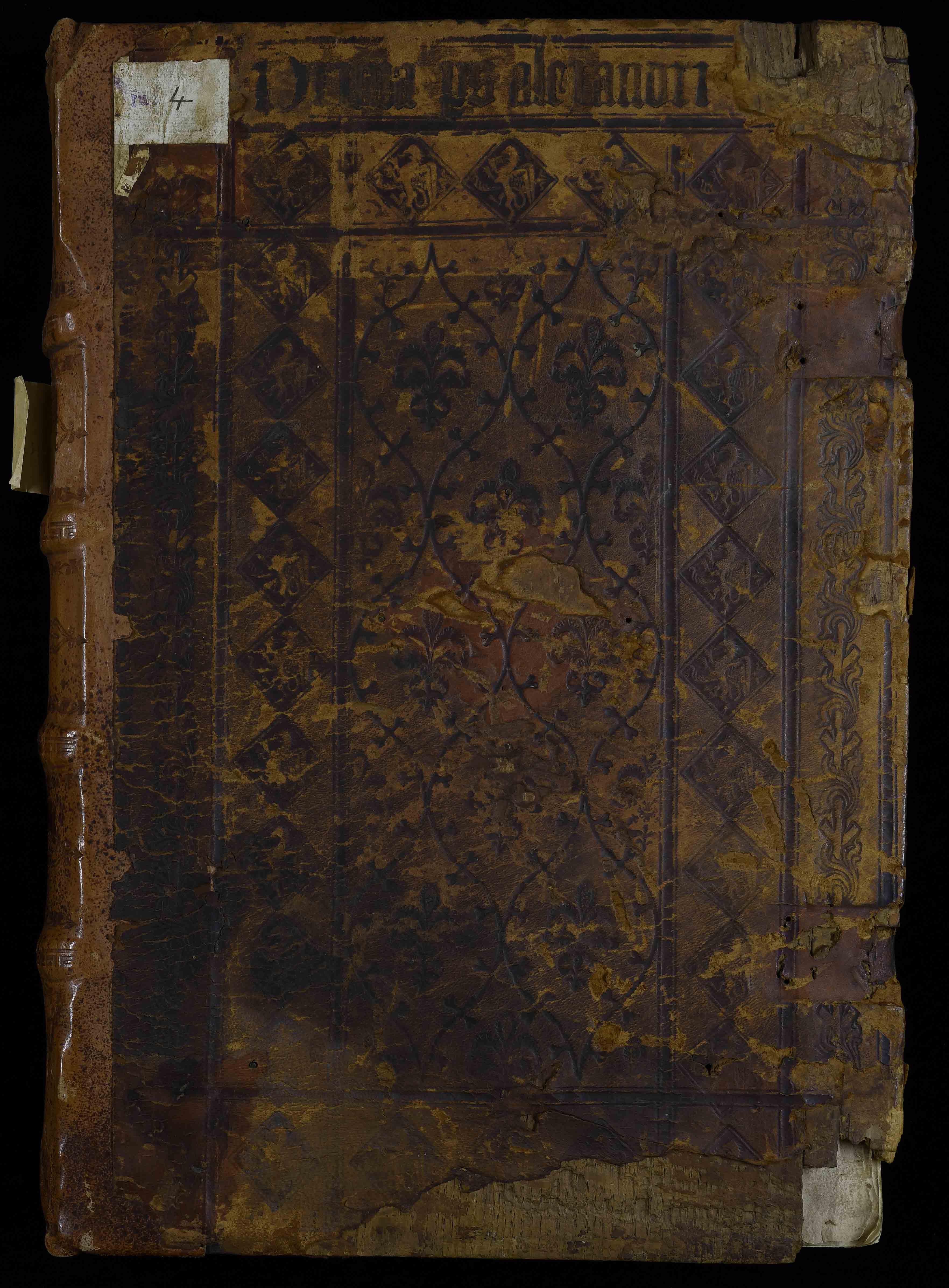 [166] c., le c. [11-2] del v. 1 sono legate dopo il primo fascicolo del v. 4, le c. [21-4] del v. 1 sono legate in fine al volume. Iniziale ornata policroma (blu, verde, rosso) campita in oro su riquadro a profili di colore contrastante con fregi marginali a volute (c. [32r] del v. 1) Legatura del XV sec., ultimo quarto, arte tedesca in piena pelle di capra tinta di bruno tendente al rosso, su assi in faggio a spigoli vivi, sul piatto anteriore decorazione di fasci di filettature parallele e cornici, impresse a secco: nella prima cornice un viticcio di foglie abbarbicato su un’asta, nella seconda una serie di ferri quadrati con un grifone rampante accollati in palo o in fascia, nello specchio classica composizione di ogive fogliate giustapposte con all’interno un ornamento di foglie stilizzato (Blattwerk) con gemma, nella fascia sotto la testata titolo impresso in caratteri gotici, il piatto posteriore ha una decorazione sostanzialmente simile che utilizza gli stessi ferri: nella prima fascia una rosa tripla alternata a un viticcio di foglie abbarbicato su un’asta, nella seconda fascia il grifone del piatto anteriore, nello specchio il Blattwerk del piatto anteriore, dorso rifatto nel sec. XIX in pelle di vitello ocra chiaro sbruffato di marrone scuro a 4 nervature doppie con caselle decorate da ferri del periodo romantico, tracce di 2 fermagli con aggancio posteroanteriore: fettucce, graffe e contrograffe metalliche mancanti, superstiti nel volume 1 le laminette in ottone incise con un motivo floreale che fissavano le fettucce, tracce dell’attacco di 8 cantonali metallici di forma romboidale e di due borchie centrali quadrilobate, tracce dell’attacco della catena nella parte superiore del piatto posteriore, le controguardie sono frammenti di edizioni non identificate del sec. XV, taglio con tracce di tinta ocra giallo, nervi spaccati, abrasioni, lacerazioni, lacune, sollevamento di lingue di pelle, tarlature, 425x635x80 mm (misura media). Appartenuto, come gli altri 3 volumi che compongono l'opera, alla Biblioteca vescovile di Trento (Borzatti , p. 3 e 11, Hausbergher 2001 , n. 10), i volumi furono trasportati nel 1810 presso il Seminario vescovile e passarono quindi alla Biblioteca comunale. Antiche segnature di collocazione: I 39 a 6-8, inc. 4.