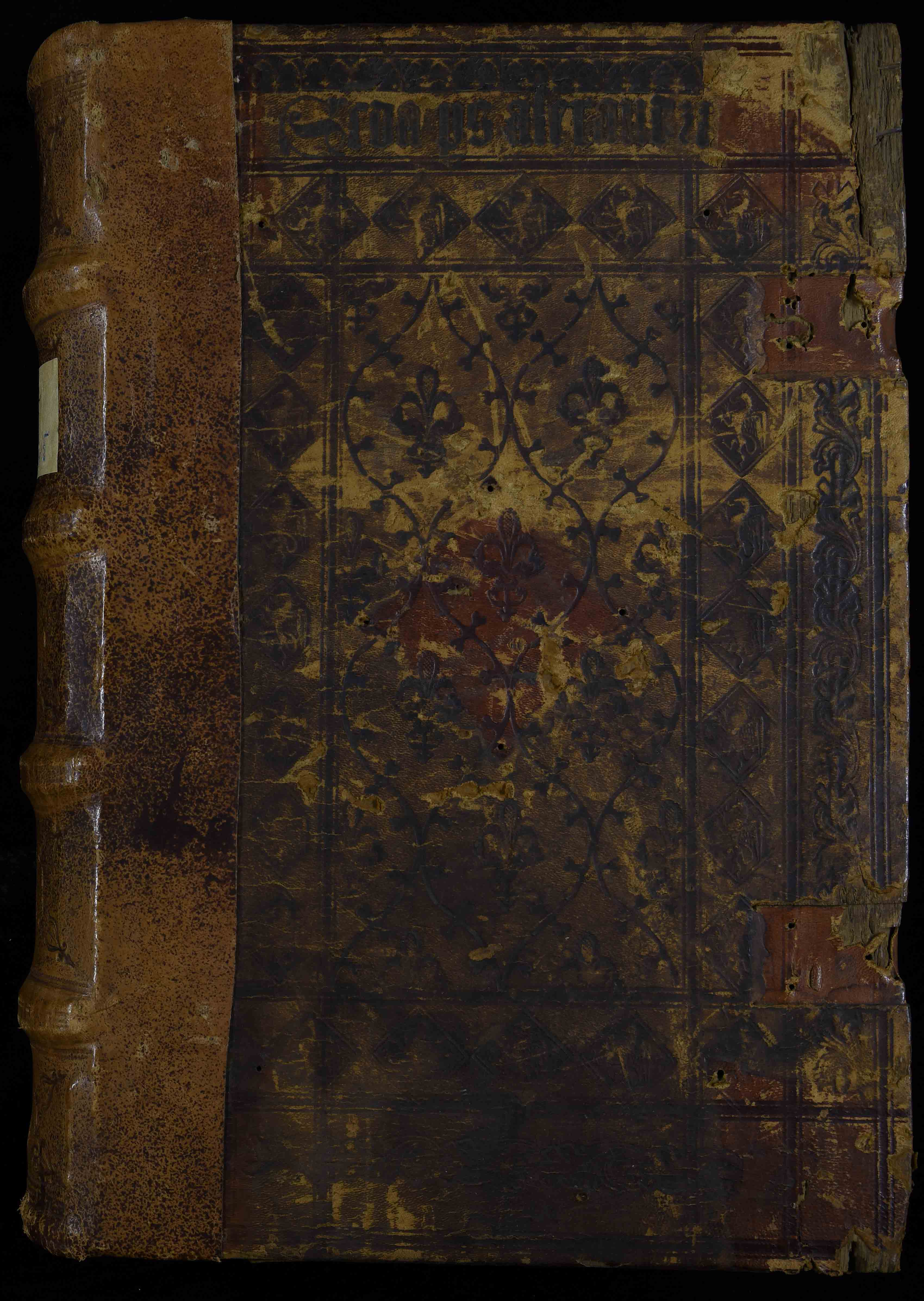[340] c., iniziale ornata policroma (blu, verde, rosso) campita in oro su riquadro a profili di colore contrastante con fregi marginali a volute ([22r] del v. 2), c. [303] e c. [304] strappate quasi completamente. Legatura del XV sec., ultimo quarto, arte tedesca (Nürnberg), in piena pelle di capra tinta di bruno tendente al rosso, su assi in faggio a spigoli vivi, sul piatto anteriore decorazione di fasci di filettature parallele e cornici, impresse a secco: nella prima cornice un viticcio di foglie abbarbicato su un’asta, nella seconda una serie di ferri quadrati con un grifone rampante accollati in palo o in fascia, nello specchio classica composizione di ogive fogliate giustapposte con all’interno un ornamento di foglie stilizzato (Blattwerk) con rametto fiorito, nella testata titolo impresso in caratteri gotici e un Bogenfries, il piatto posteriore ha una decorazione (tipo 35) sostanzialmente simile che utilizza gli stessi ferri: nella prima una rosa tripla alternata a un viticcio di foglie abbarbicato su un’asta, nella seconda fascia il Blattwerk del piatto anteriore, nello specchio un ferro romboidale con un altro Blattwerk, dorso rifatto nel sec. XIX in pelle di vitello ocra chiaro sbruffato di marrone scuro a 4 nervature doppie con caselle decorate da ferri del periodo romantico, tracce di 2 fermagli con aggancio posteroanteriore: fettucce, graffe e contrograffe metalliche mancanti, tracce dell’attacco di 8 cantonali metallici di forma romboidale, mancanti 3 e di due borchie centrali quadrilobate, mancanti, tracce dell’attacco della catena nella parte superiore del piatto posteriore, conservate le controguardie cartacee, taglio con tracce di tinta ocra giallo, nervi spaccati, abrasioni, lacerazioni, lacune, sollevamento di lingue di pelle, tarlature, 420x660x90 mm. Appartenuto, come gli altri 3 volumi che compongono l'opera, alla Biblioteca vescovile di Trento (Borzatti , p. 3 e 11, Hausbergher 2001 , n. 10), i volumi furono trasportati nel 1810 presso il Seminario vescovile e passarono quindi alla Biblioteca comunale. Antiche segnature di collocazione: I 39 a 6-8, inc. 5.